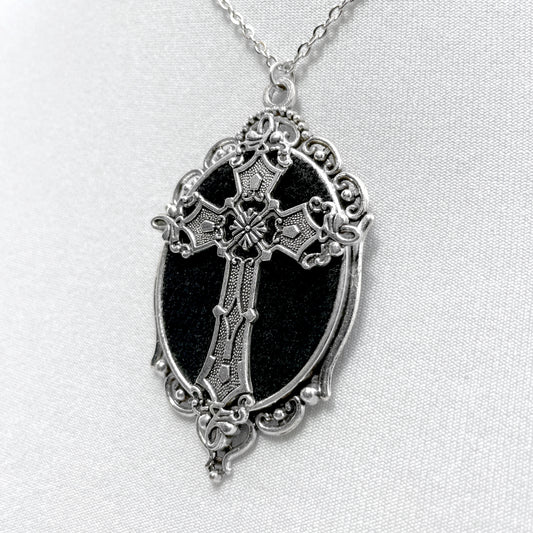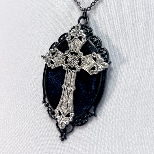 Black and Silver Gothic Cross on Black Velvet Necklace