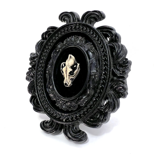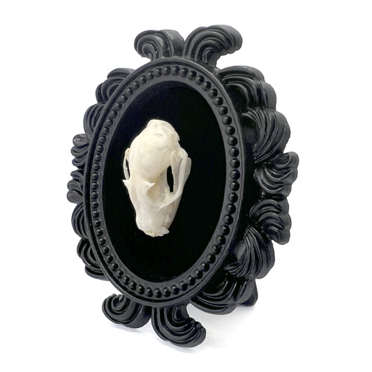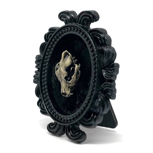 Small Black Resin Oval Frame with Small Resin Cat Skull on Black Velvet Gothic Home Deco