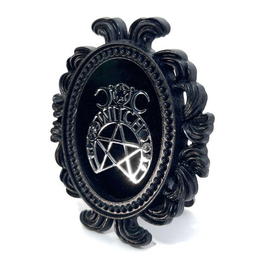 Small Black Resin Oval Frame with Silver 'Witch' on Black Velvet Gothic Home Deco