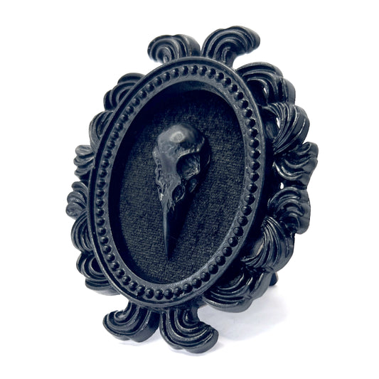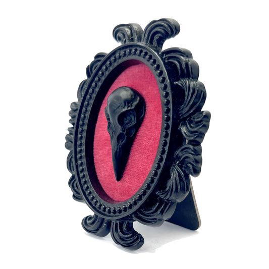 Small Black Resin Oval Frame with Black Bird Skull on Black Velvet Gothic Home Deco