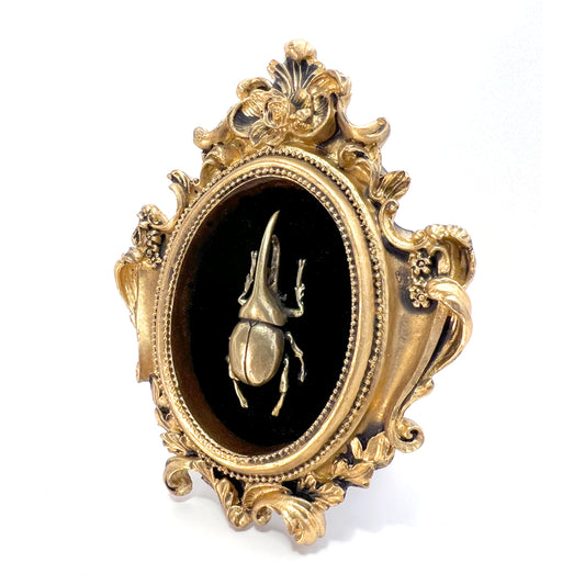 Small Antiqued Gold Framed Horned Brass Beetle on Black Velvet