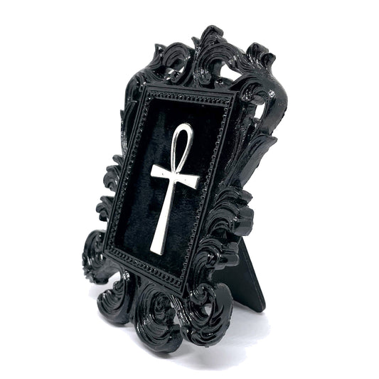 Small Black Resin Square Frame with Silver Ankh on Black Velvet Gothic Home Deco
