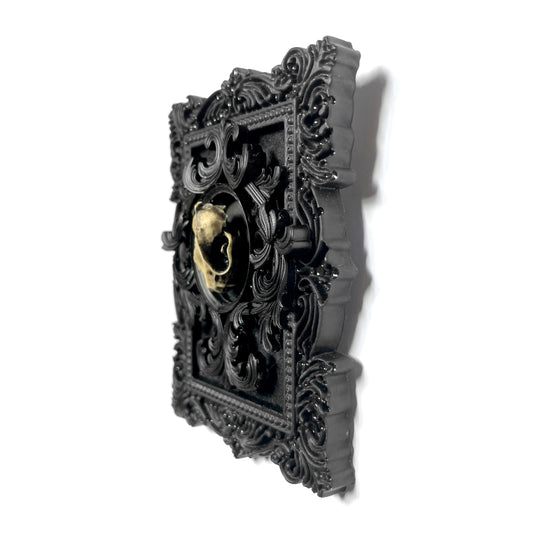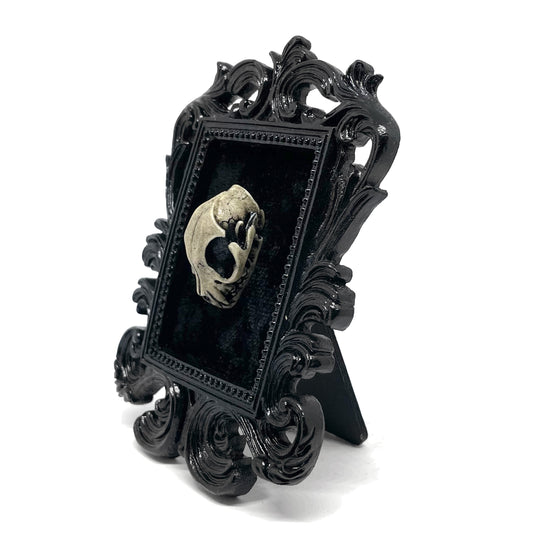 Small Black Resin Square Frame with Resin Cat Skull on Black Velvet Gothic Home Deco