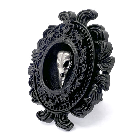 Small Black Resin Oval Frame with Metal Bird Skull on Black Velvet Gothic Home Deco