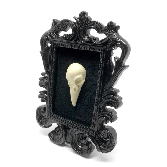Small Black Resin Square Frame with Natural Bone Colored Resin Raven Skull on Black Velvet Gothic Home Deco