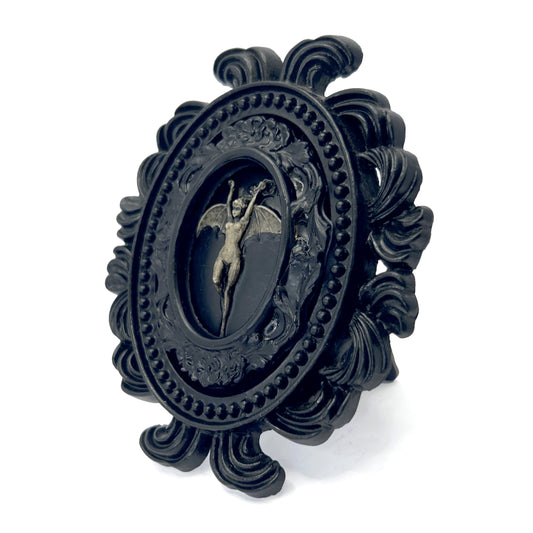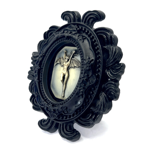 Small Black Resin Oval Frame with Bat Woman on Black Velvet Gothic Home Deco