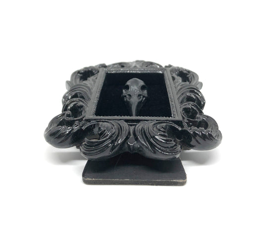 Small Black Resin Square Frame with Black Resin Bird Skull on Black Velvet Gothic Home Deco
