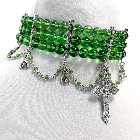 Green Beaded Gothic Choker Necklace with Crosses and Bats