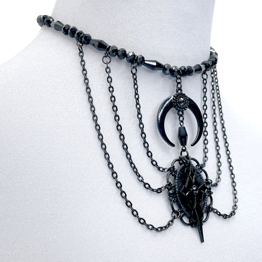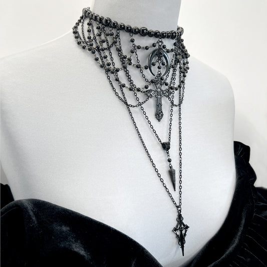 Black Multi-Strand Gothic Necklace with Crescent Moon and Cross