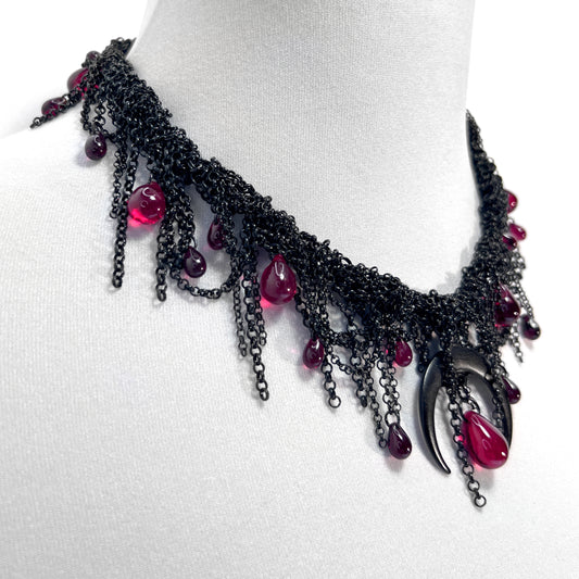 Black Woven Chain with Moon and Blood Red Czech Bead Gothic Necklace