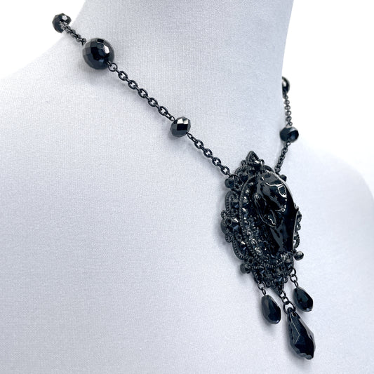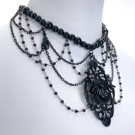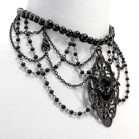 Black Multi-Strand Beaded Gothic Necklace with 4 Pendants