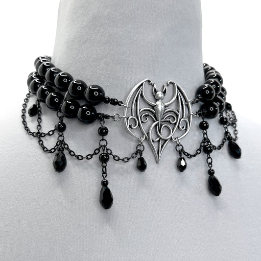 Silver and Black Beaded Gothic Choker Necklace with Bats