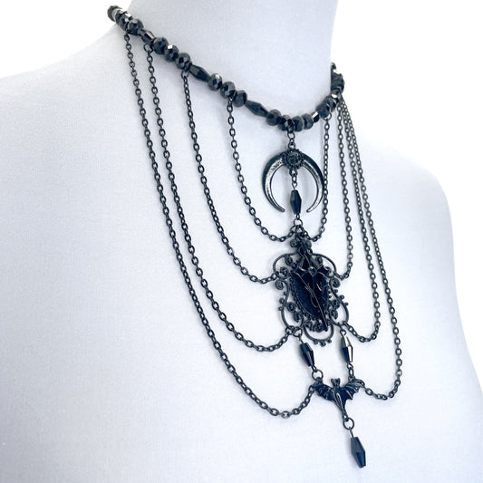 Black Multi-Strand Gothic Necklace with Moon, Cross, and Bat