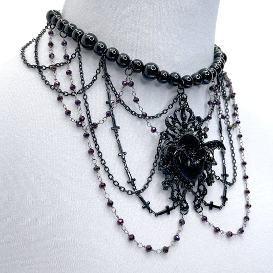 Black Beaded Gothic Necklace with Purple Bead Chain and Bat