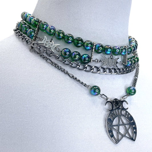 Iridescent Green Beaded Choker with Silver Crescent Moons and Pentacles Gothic Necklace