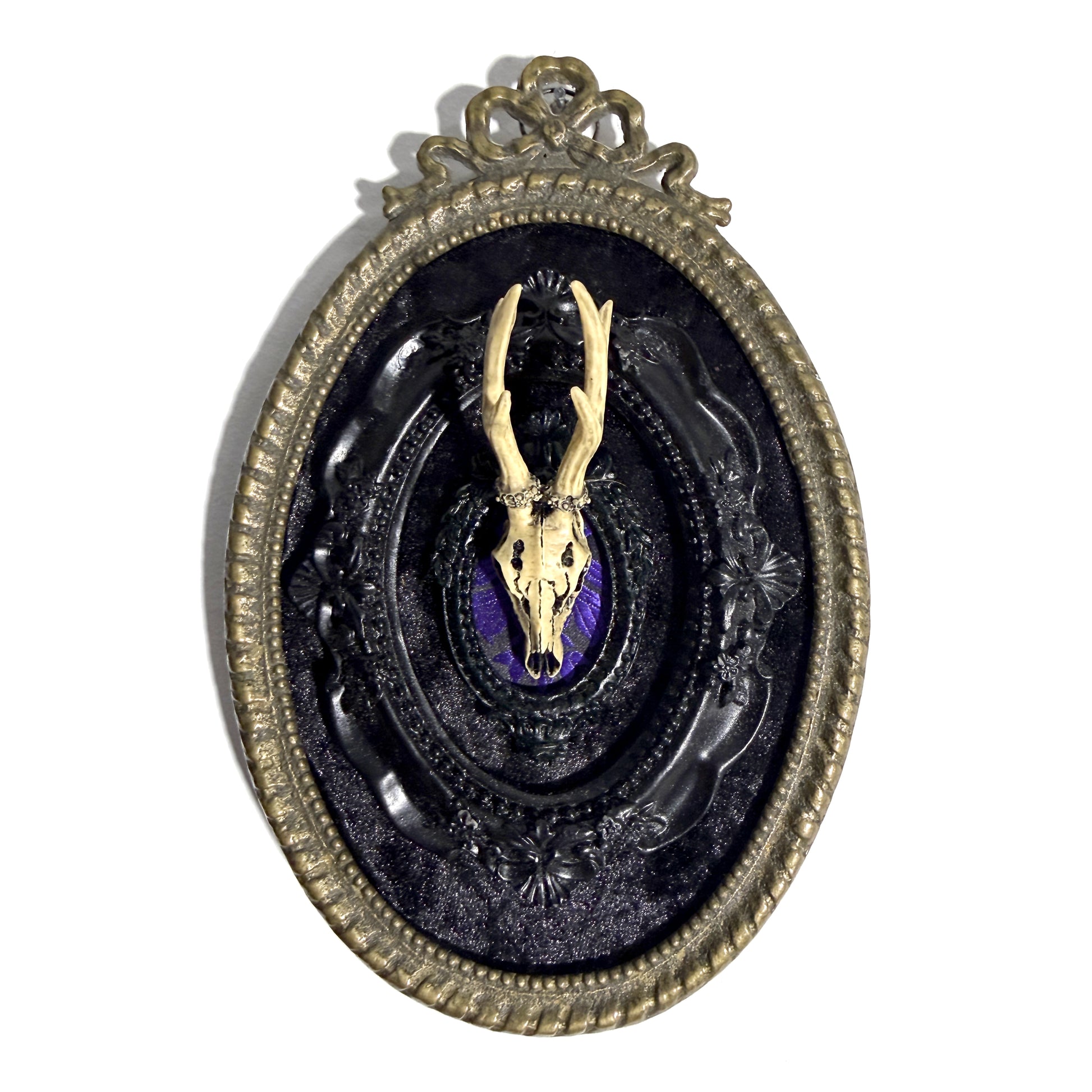 Oval brass metal antique frame with a bow on top. The background in the frame is black velvet. In the center are two black resin oval frames with an antiqued resin deer skull on purple and black brocade fabric. The frame is 12 cm wide and 18 ¾ cm tall.