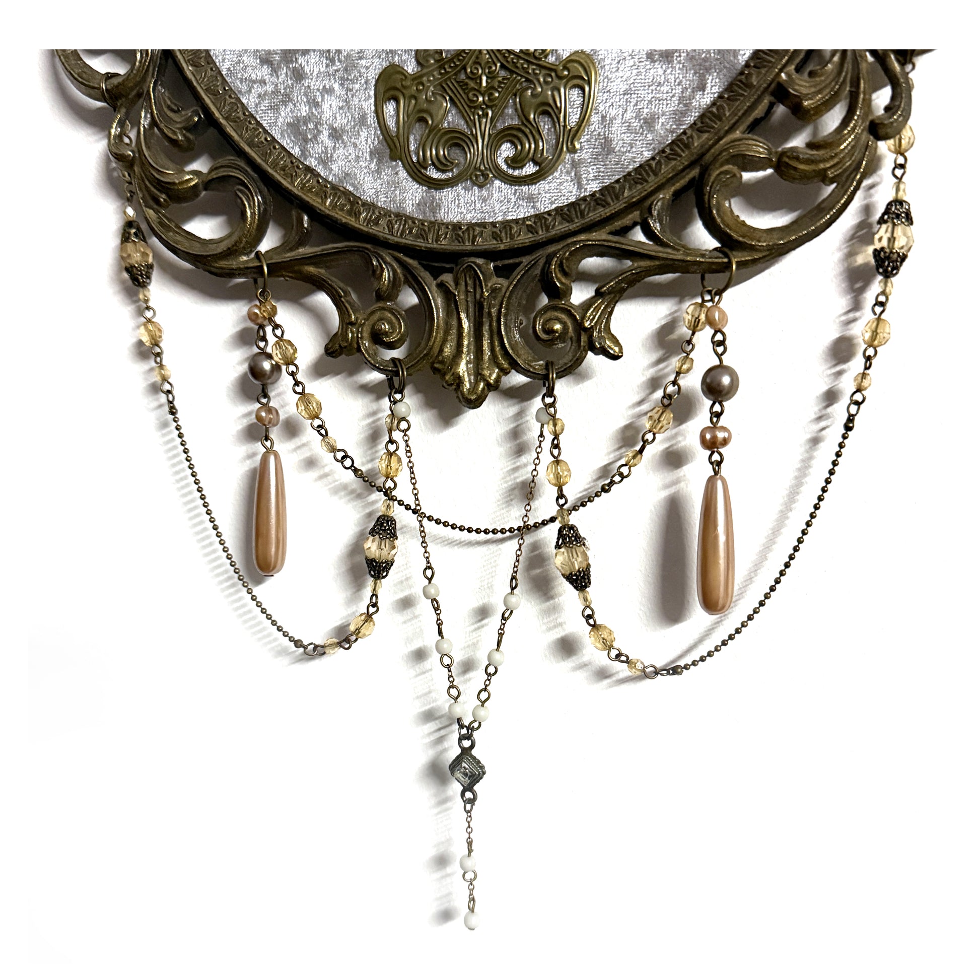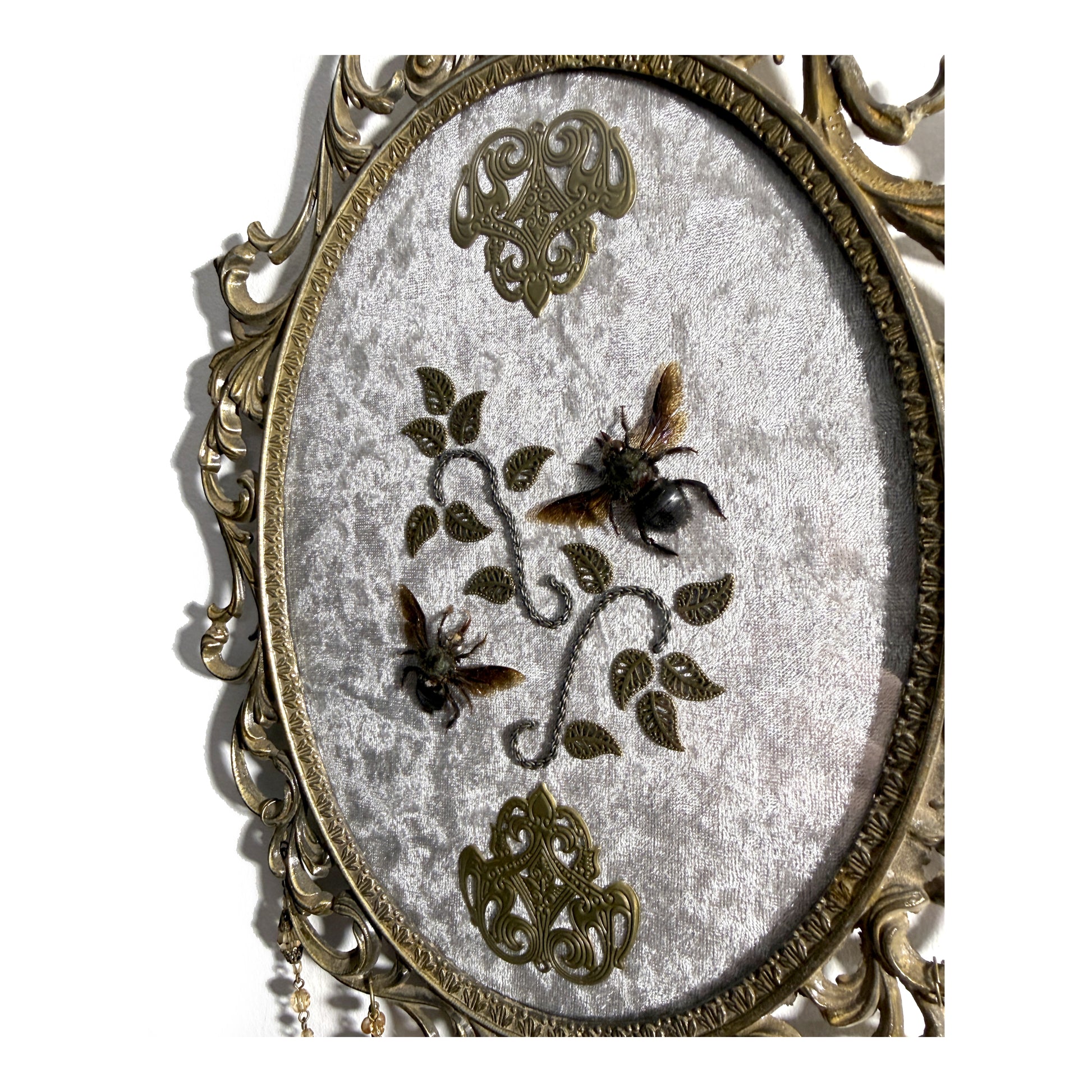 Ornate oval brass metal antique frame with 'Made in Italy' on the back. I have added grey crushed velvet to the background. here are 2 real black wood bees with chain and metal leaf decoration, along with a decorative brass ornament on the top and bottom. This frame has the original domed antique glass. Hanging from the bottom of the frame are vintage necklace chain and charms. This is one of my larger antique frames at 23 ½ cm wide and 33 cm tall, 45 cm including chains on the bottom. I add velvet to the back of all antique frames so they don't damage your walls.