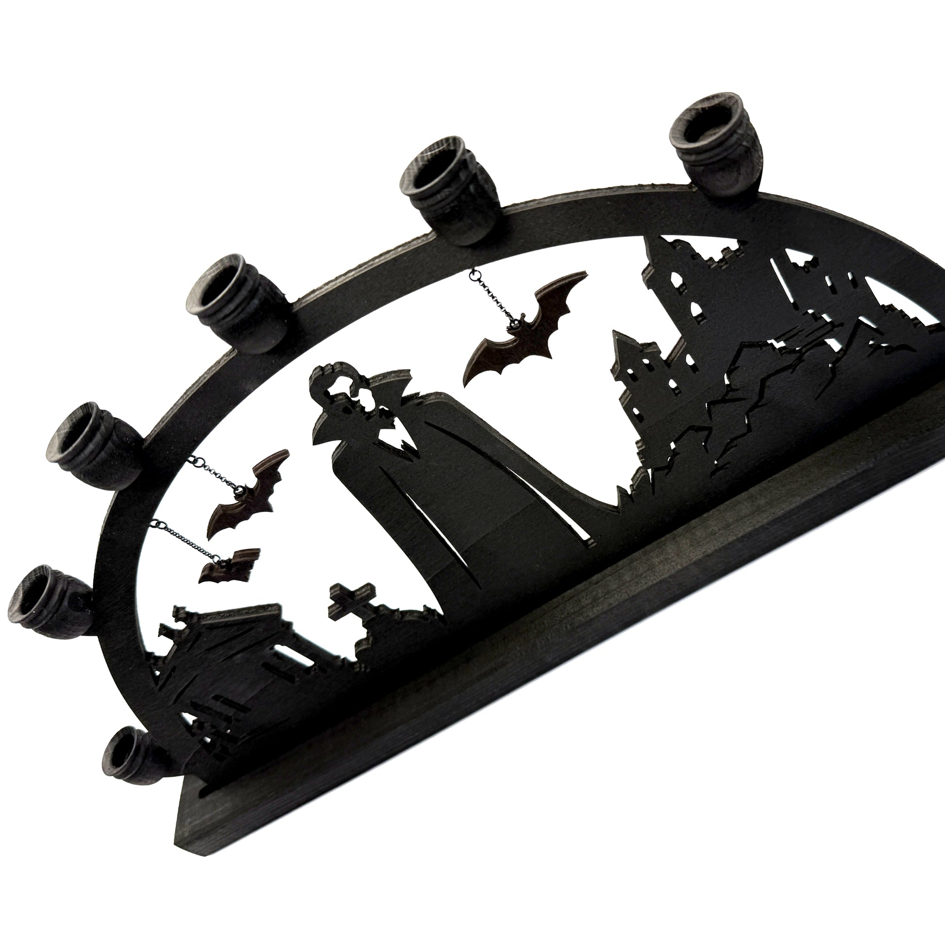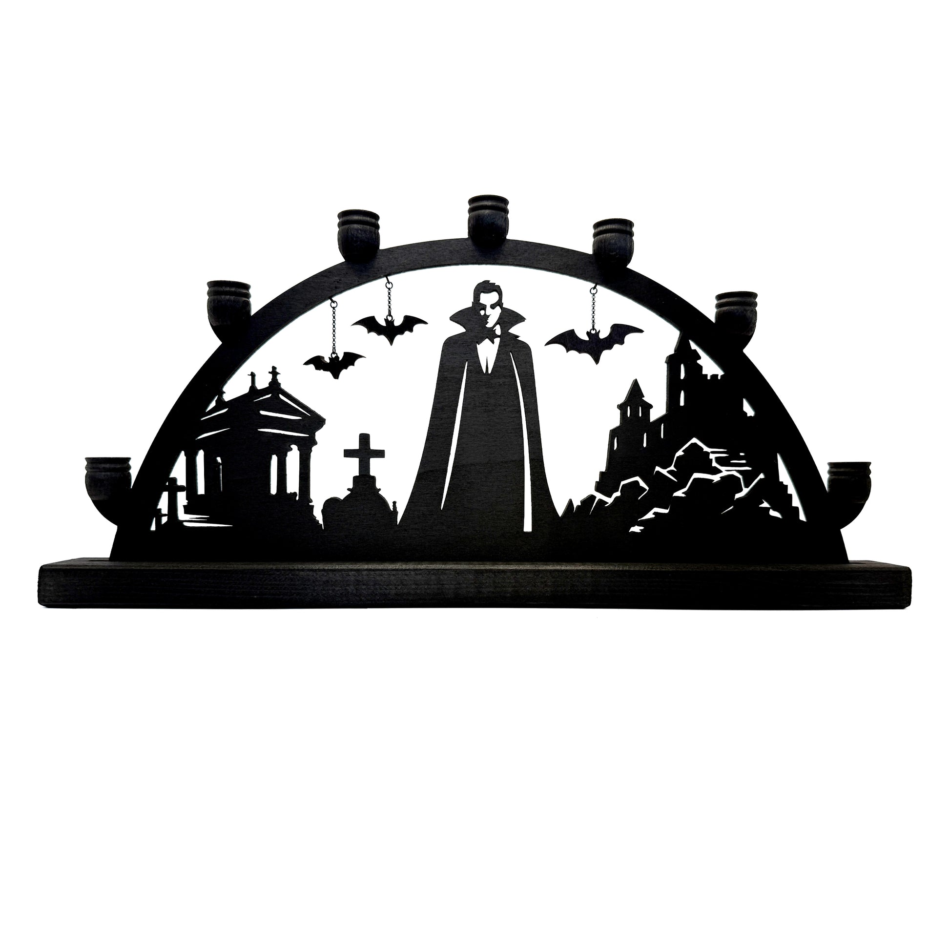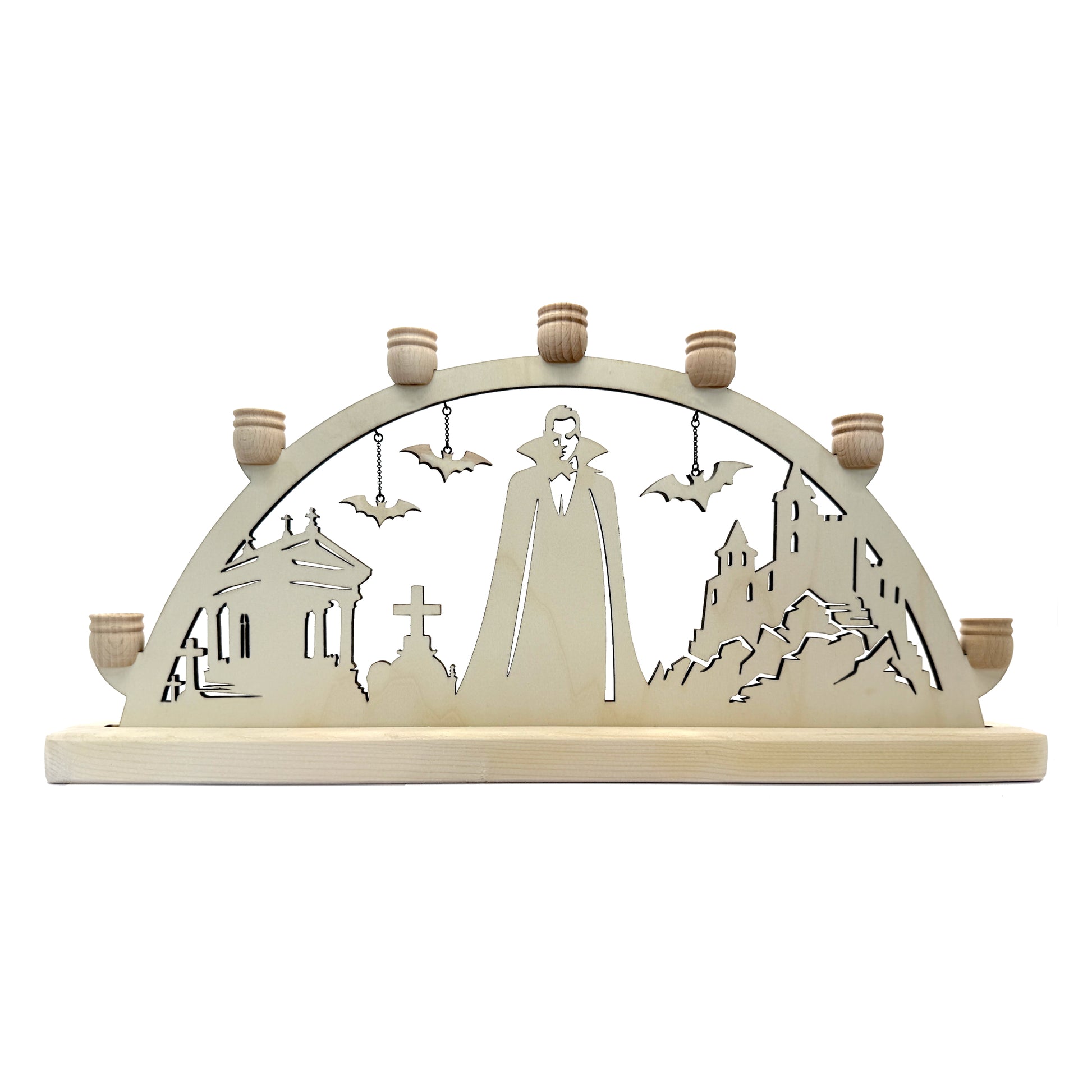 Dracula large schwibbogen made from a lightweight 6mm thick wood. It has Dracula with a crypt, castle, and 3 different size bats hanging from chains so they appear to fly. Each schwibbogen is individually cut and assembled. It holds 7 14mm LED or regular candles. The bow is available in natural wood or black. The black used is a wood stain, not paint, which can show the wood grain and imperfections.