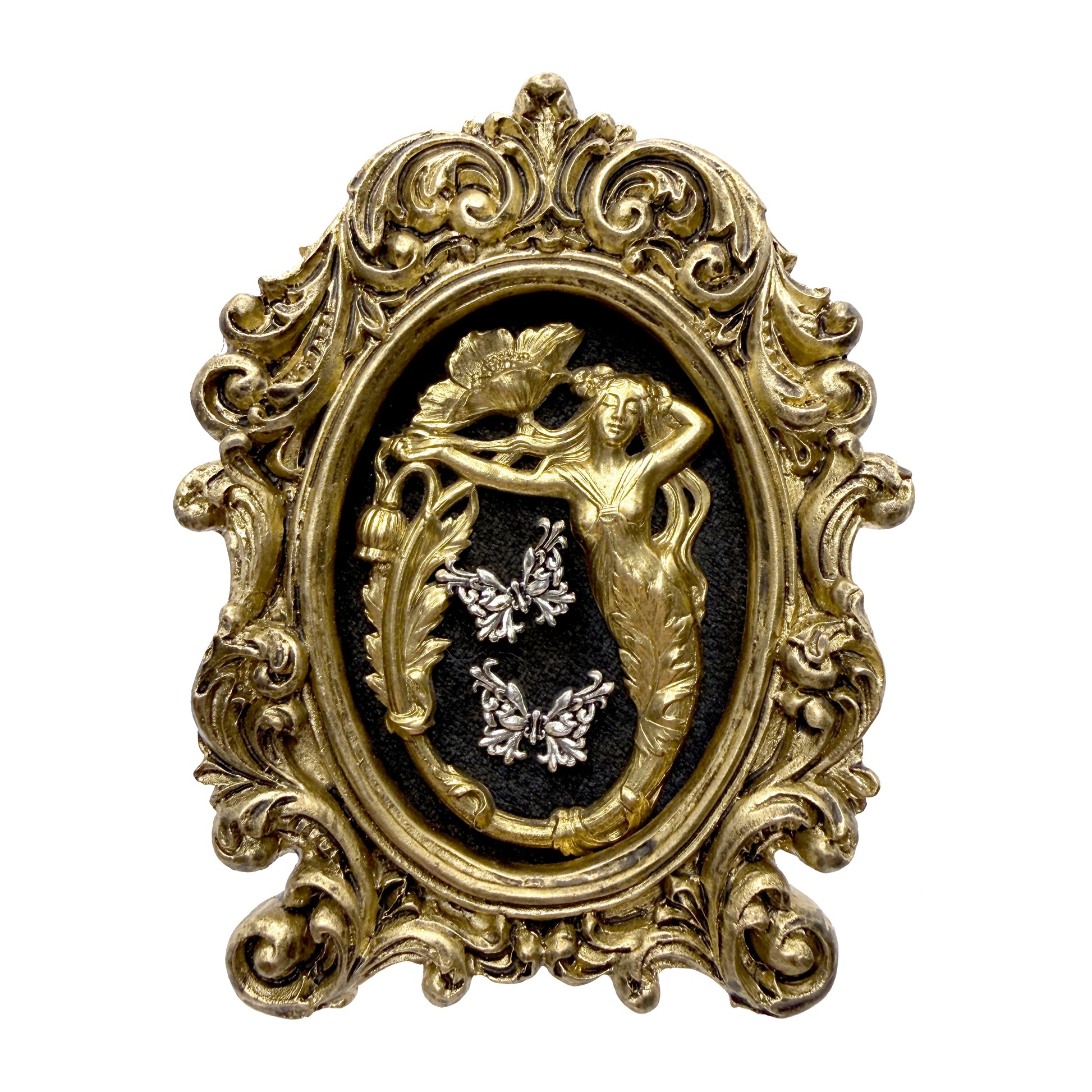 Pretty little ornate aged gold resin frame with a gold mermaid and 2 silver butterflies on black velvet. The frame measures 9 ¼ cm wide by 11 ½ cm tall and is 1 ¼ cm deep, and is made to be set on a flat surface.