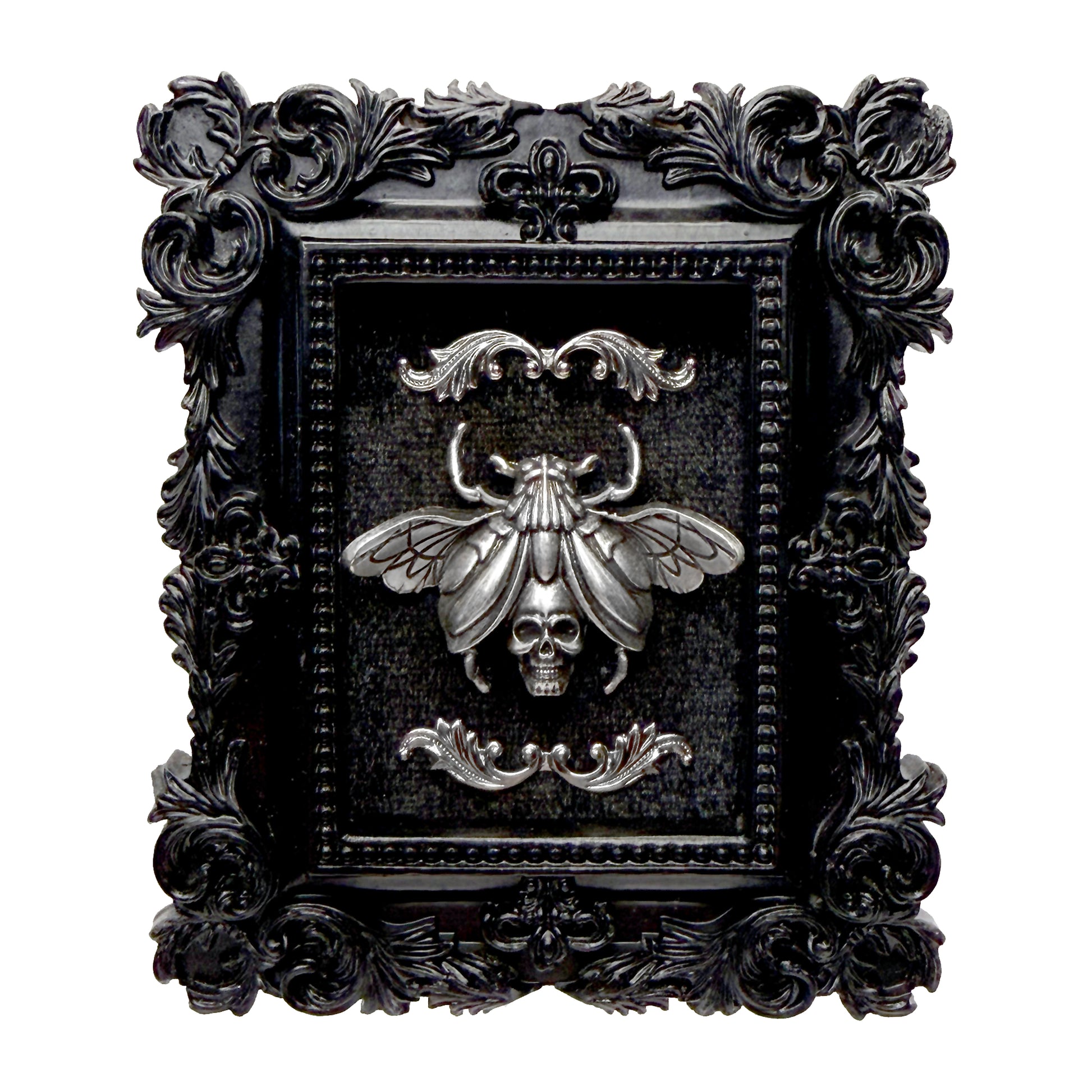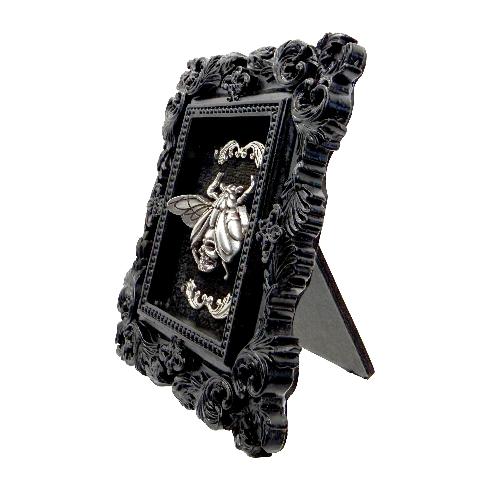 Pretty little ornate square black resin frame with a silver winged beetle that has a skull body on black velvet. There are also small silver ornaments on the velvet above and below the beetle. The frame measures 7 ¾ cm wide by 9 ¼ cm tall and is 1 cm deep and is made to be set on a flat surface.