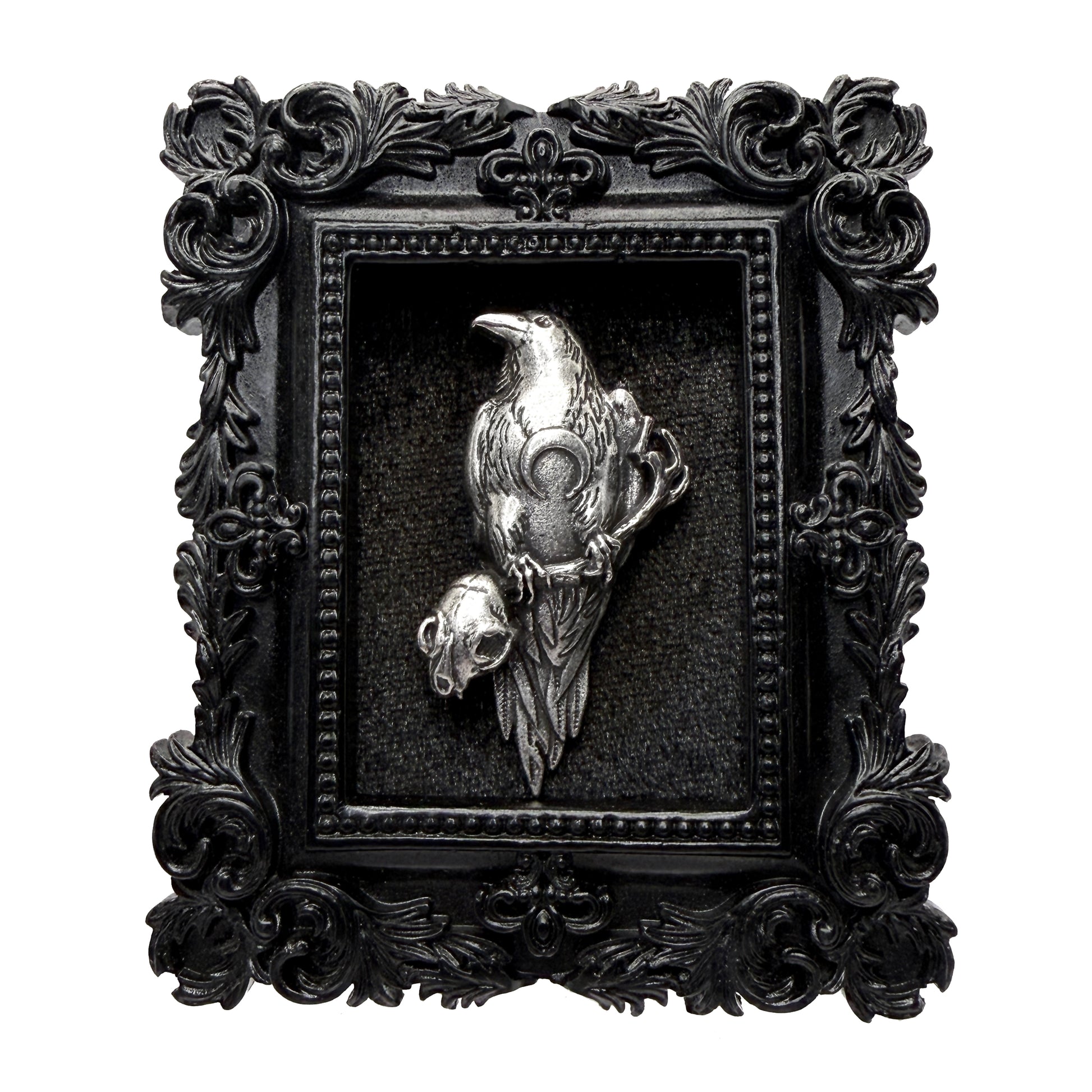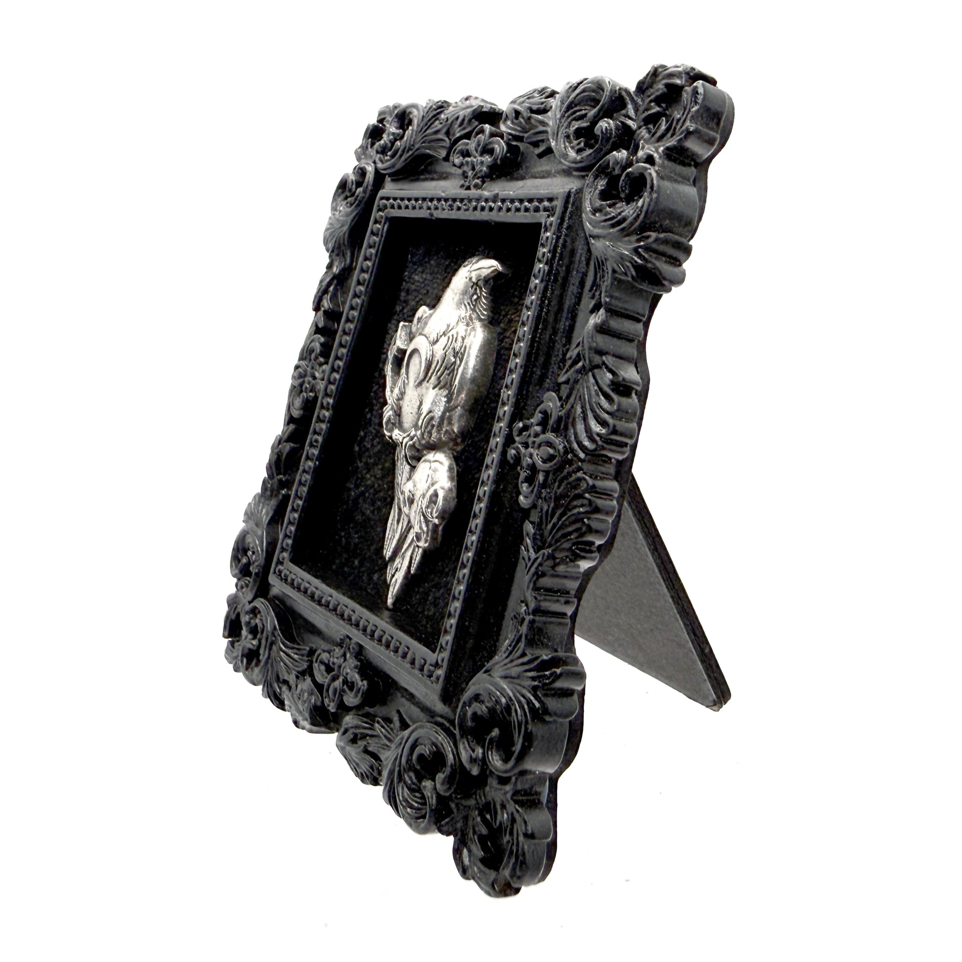 Pretty little ornate square black resin frame with a silver crow with a crescent moon on the chest and a skull next to the feet on black velvet. The frame measures 7 ¾ cm wide by 9 ¼ cm tall and is 1 cm deep and is made to be set on a flat surface.
