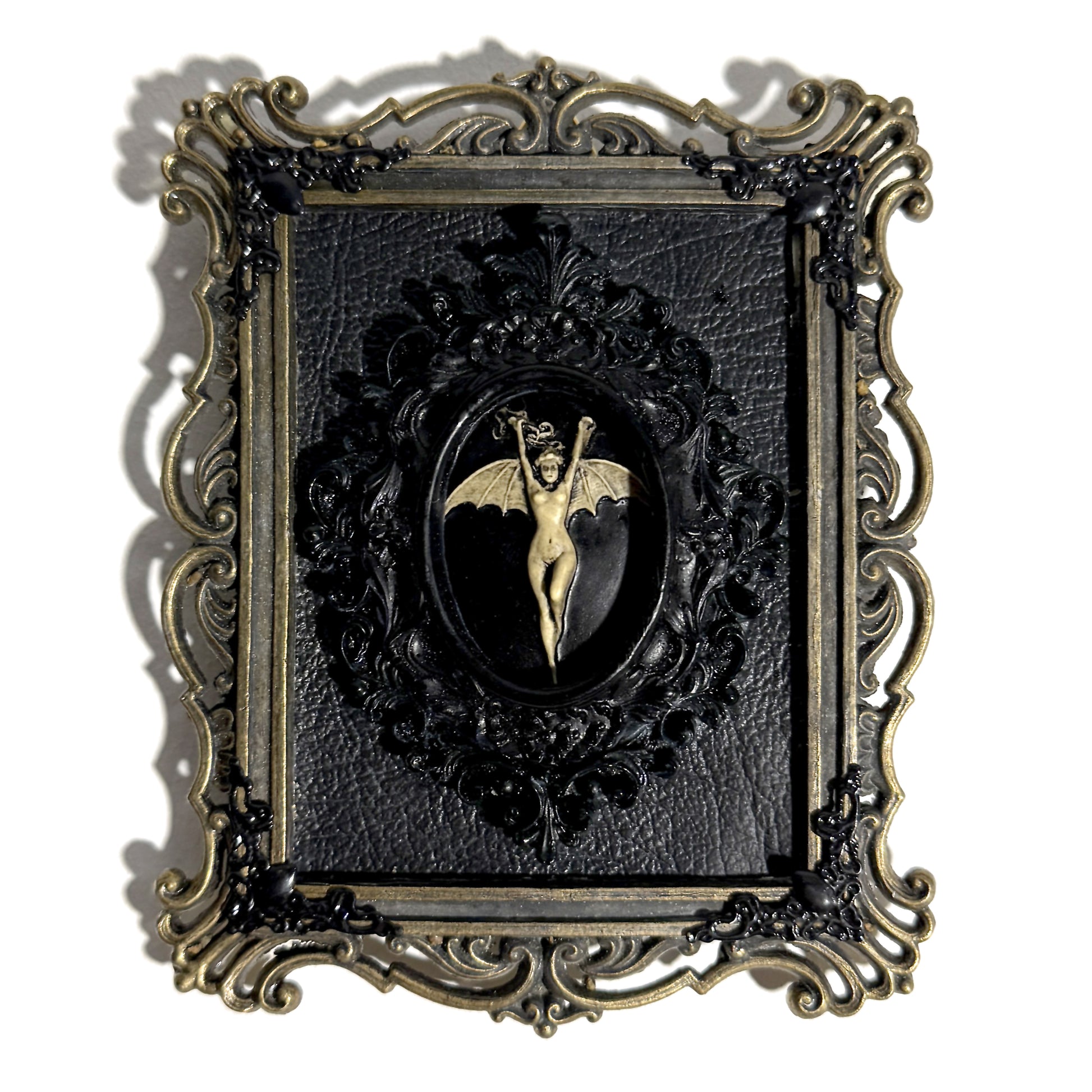Gorgeous Art Nouveau square brass metal antique frame marked "Made Italy" on the back. The background in the frame is black leather. In the center is a black resin oval frame with an antiqued black bat woman cameo. I have added black metal ornaments to the 4 inner corners of the frame. The frame is 9 ¾ cm wide and 12 cm tall.