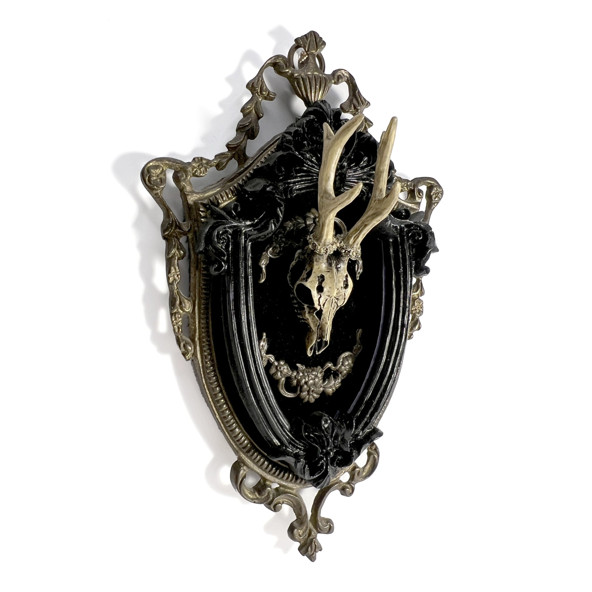 Unusual shield shaped antique brass frame. The background is black velvet material. In the center is an antiqued resin deer skull with a brass crescent ornament above and below it. I have added a very ornate black shield shaped resin frame around the deer skull. The frame is 10 ¾ cm wide and 16 ½ cm tall.