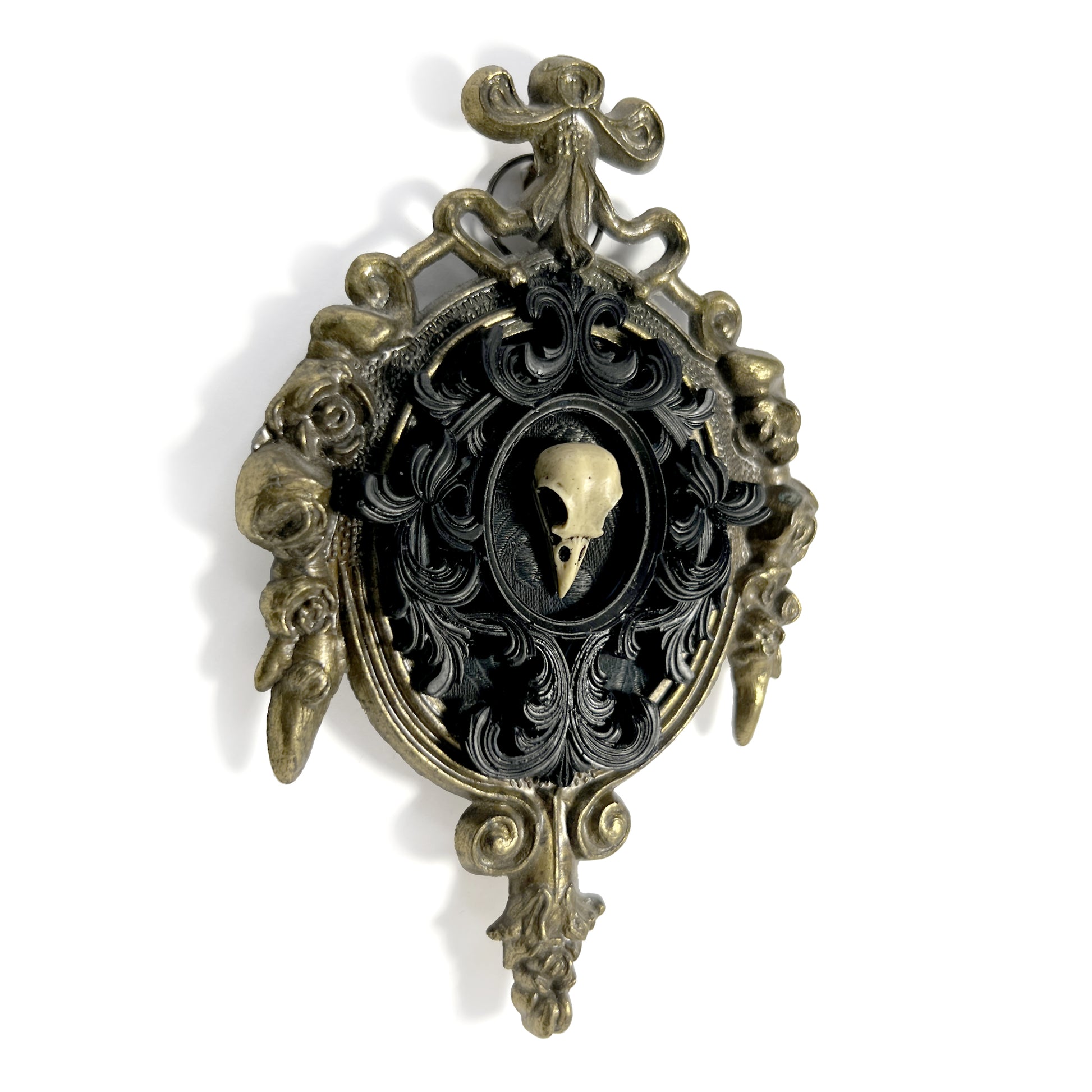 Brass ornate metal antique frame marked "Made in Italy" on the back. The background is a patterned black on black fabric. It has an antiqued resin bird skull in the center with a detailed black resin frame around it. The frame is 8 ½ cm wide and 12 ½ cm tall.