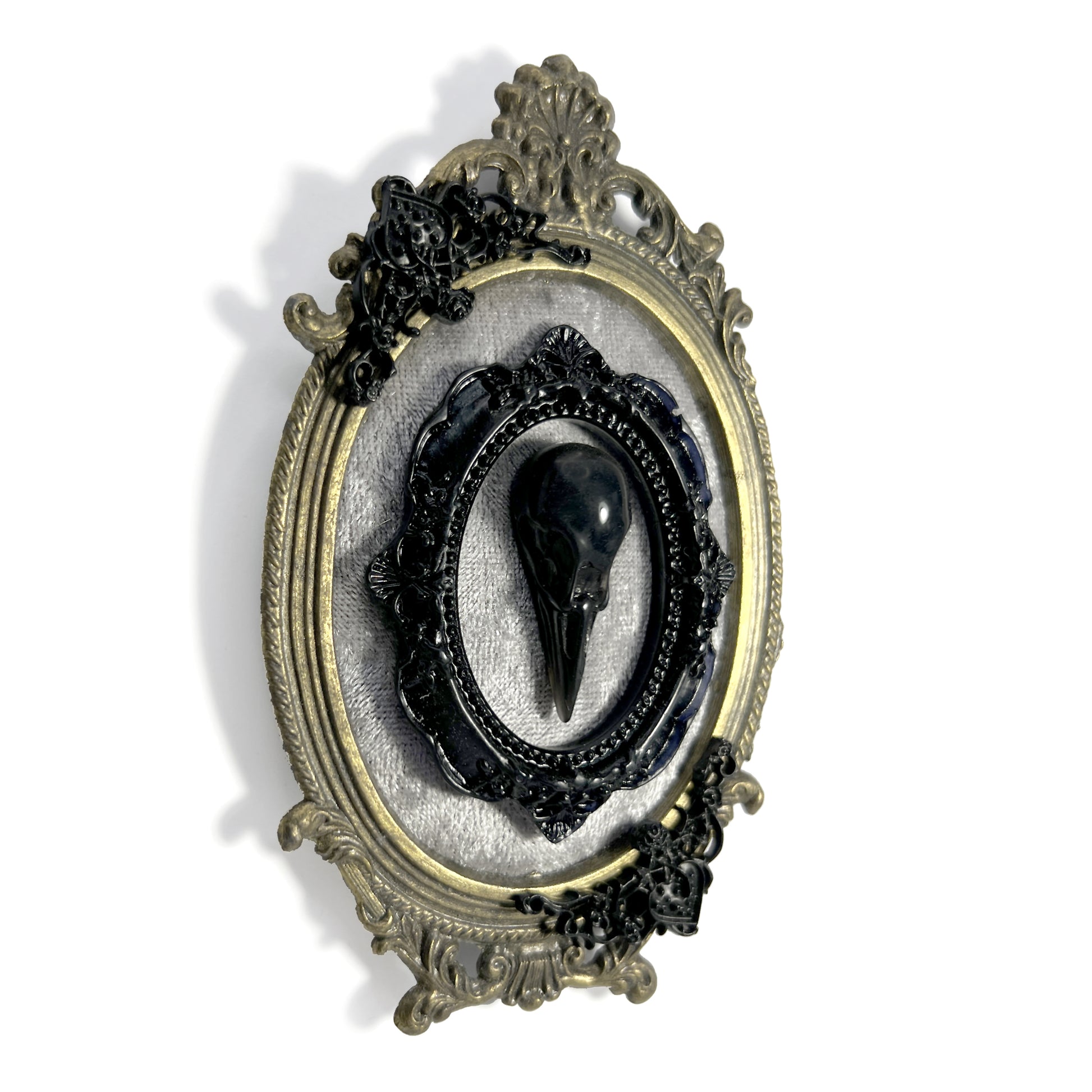 Dark brass oval metal antique frame with 'Italy' on the back. It has grey velvet fabric for the background. There is a shiny black resin bird skull in the center with a black resin ornate frame on the velvet. I have also added 2 matte black metal ornaments to the top left and bottom right of the frame. The frame is 8 cm wide and 13 cm tall.