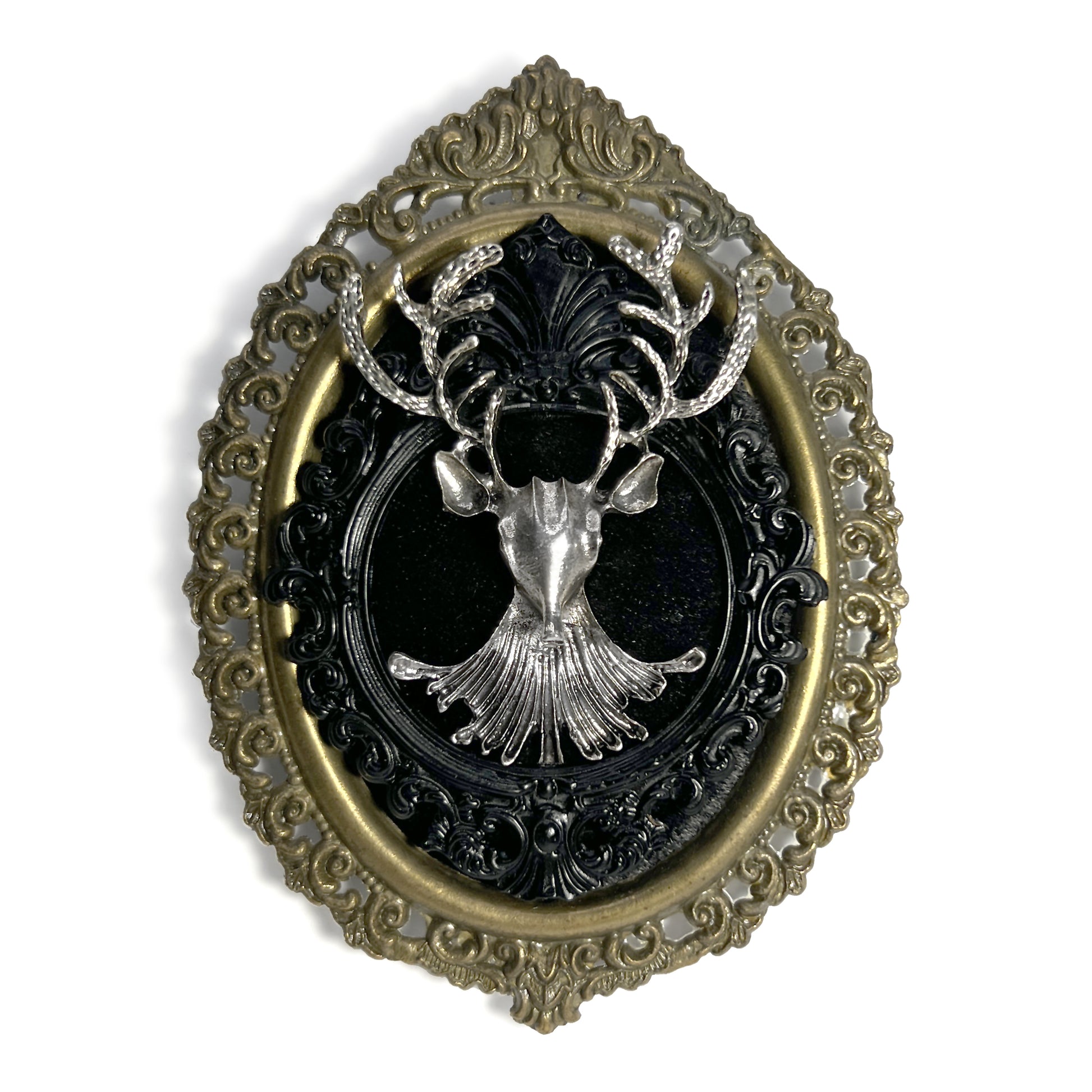 Silver Deer Head on Black Velvet Antique Framed Home Deco