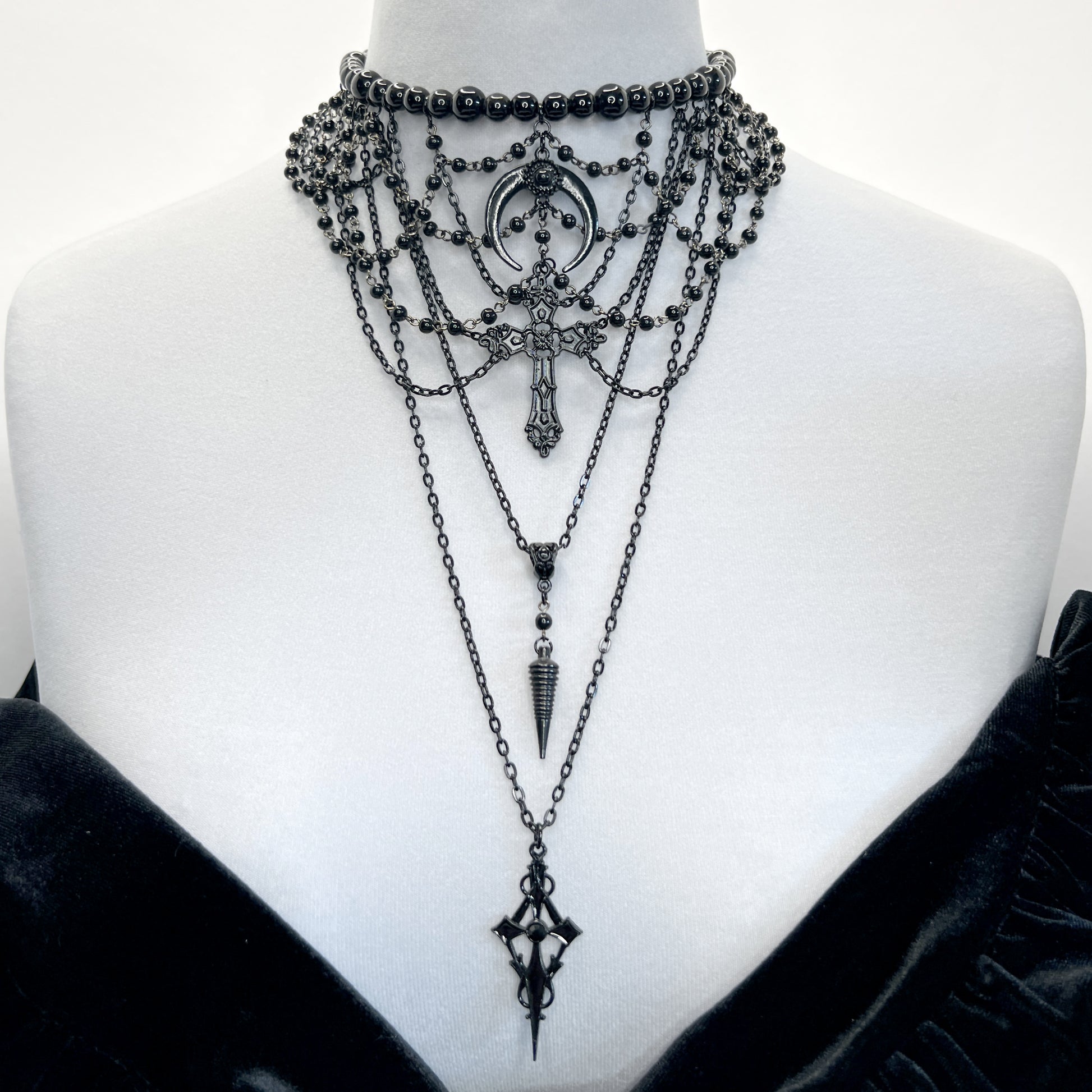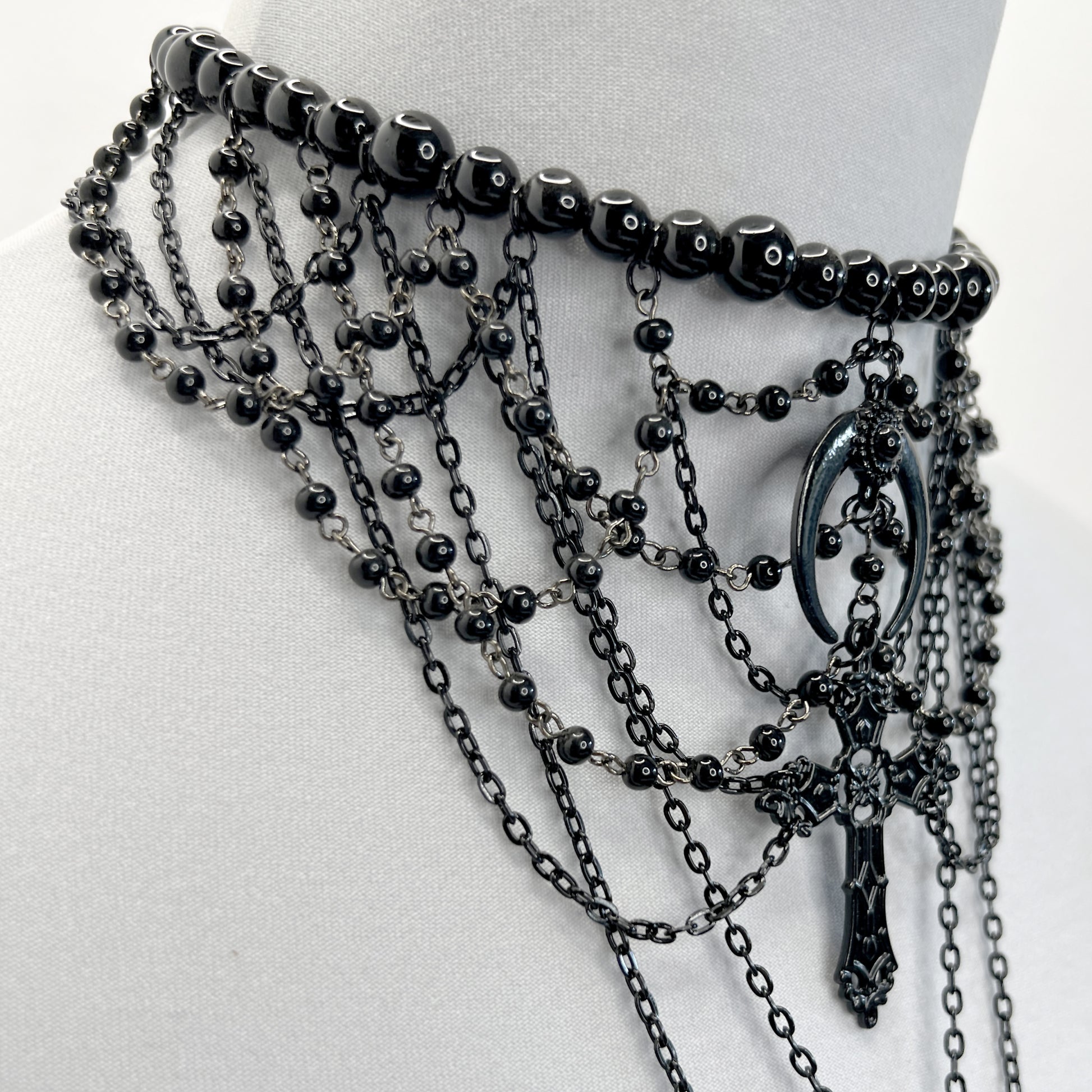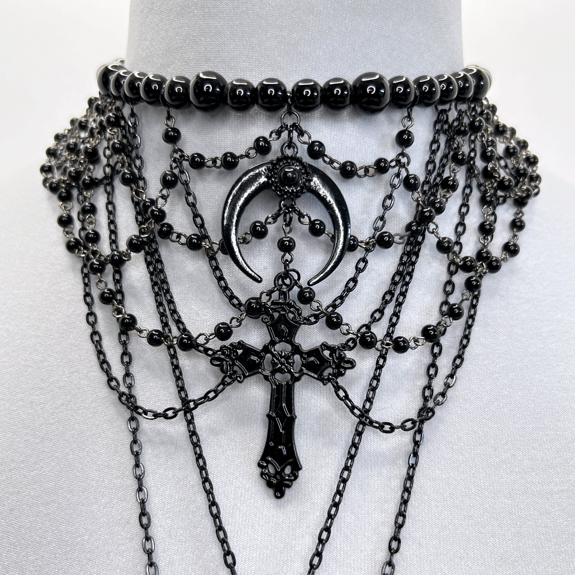 This necklace sits at the base of the neck, choker style, with multiple black chains draped from a hanging black crescent moon and gothic cross. The black glass bead base necklace is on a wire to retain it's circle shape. It has multiple rows of draped vintage black beaded chain, a spike pendant on an ornate bale, and a long chain with a pointed gothic cross. It looks like three separate necklaces when worn - the beaded choker, the spike, and the pointed cross. The necklace length is adjustable. All chains and hardware used are stainless steel. This is the last of the vintage black beaded chain I have, so this necklace cannot be duplicated.