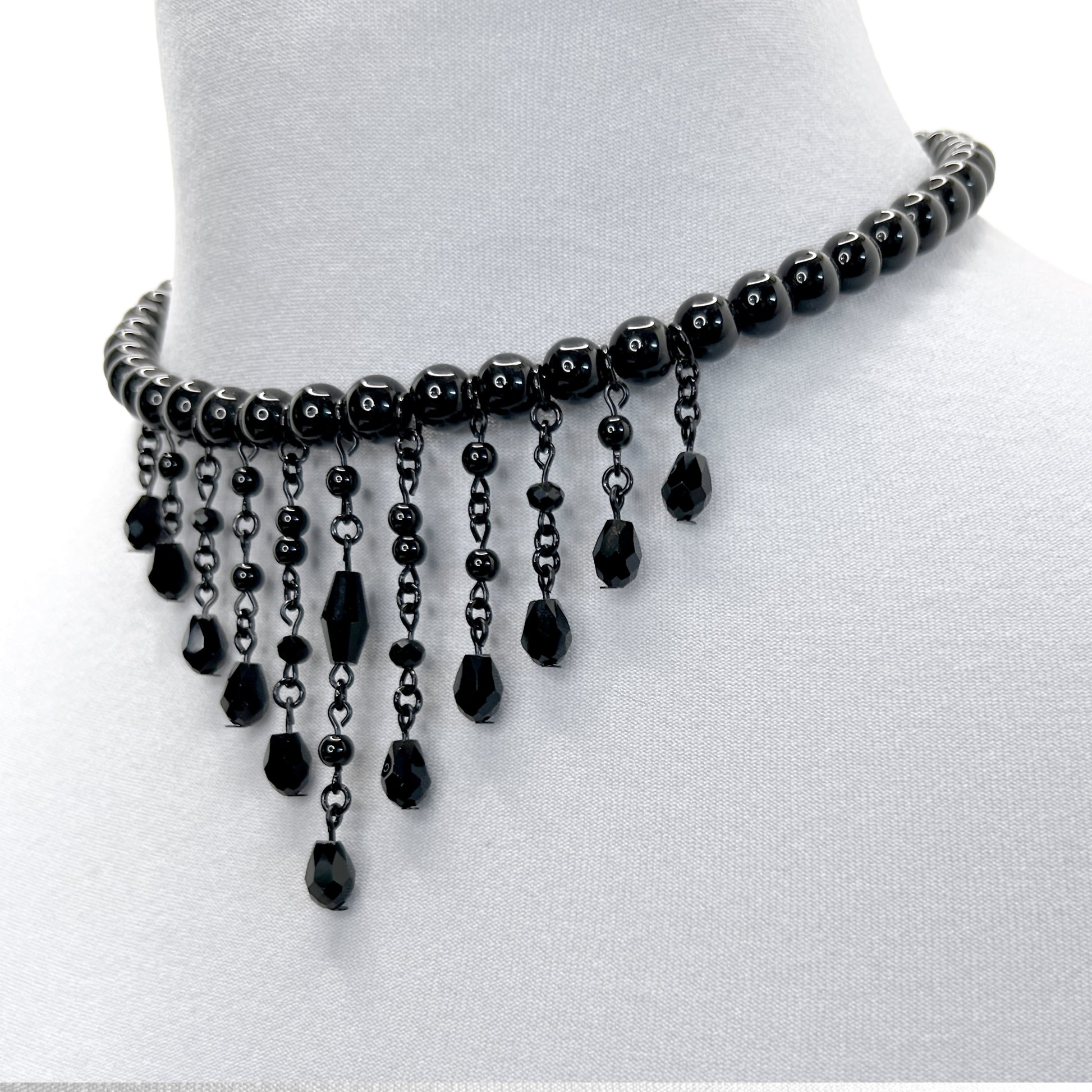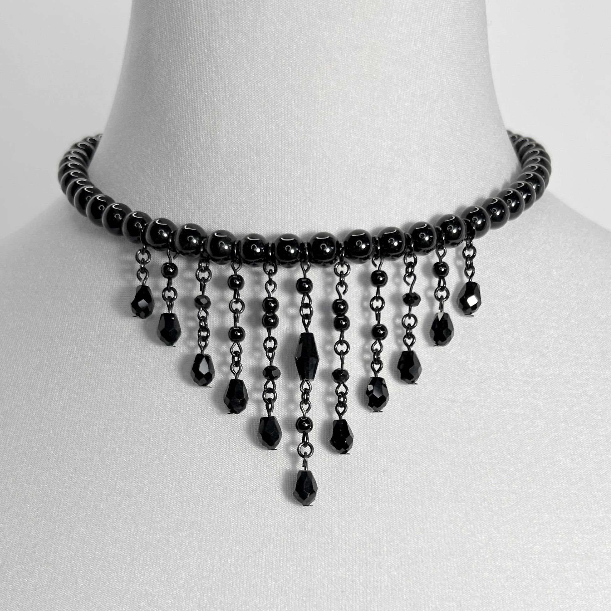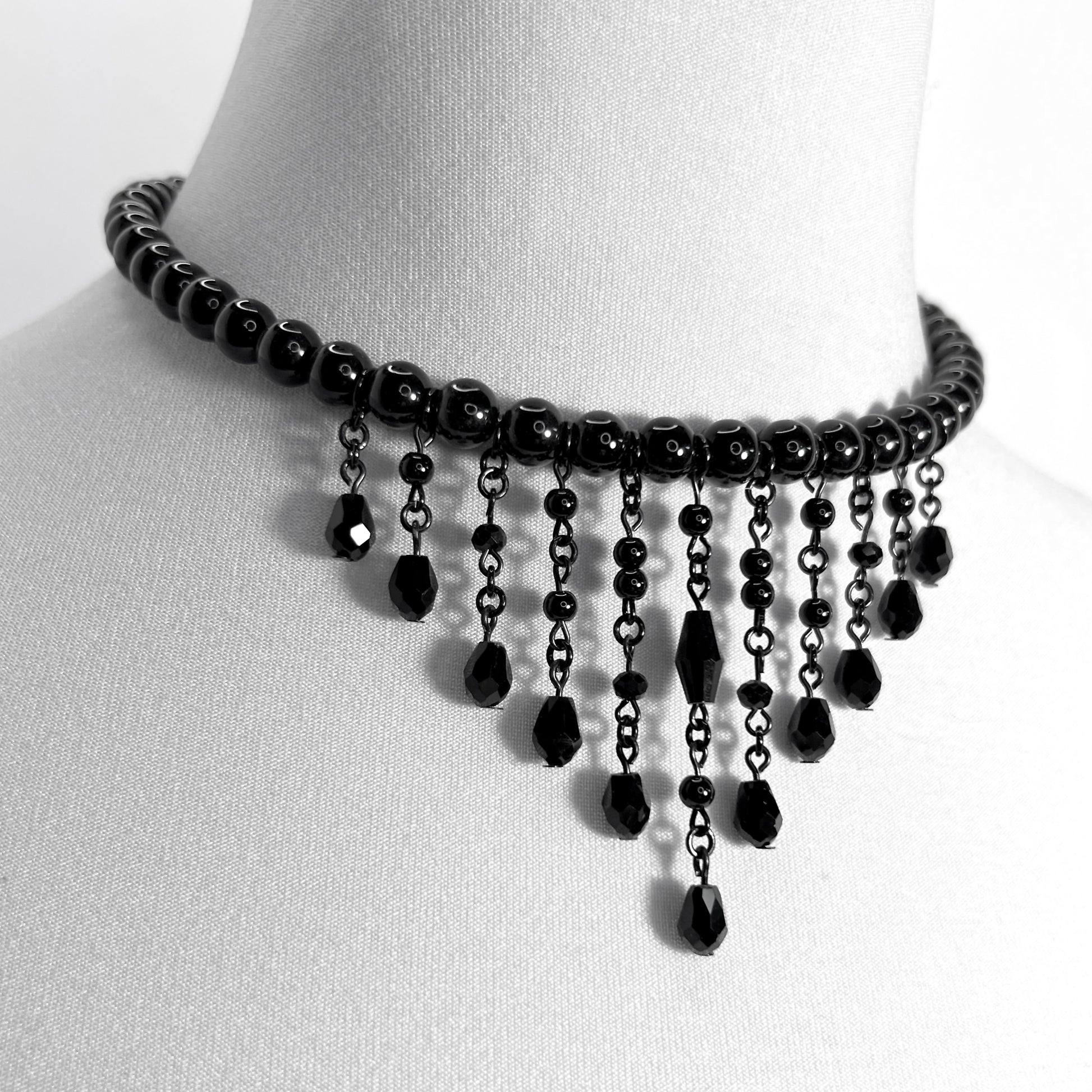 This necklace sits at the base of the neck, choker style, with multiple linked black bead chains hanging down, forming a V shape in the front. The black glass bead base necklace is on a wire to retain it's circle shape. The base necklace is 36 cm long with a 5 ½. cm chain to make it longer. All chains and hardware used are stainless steel.