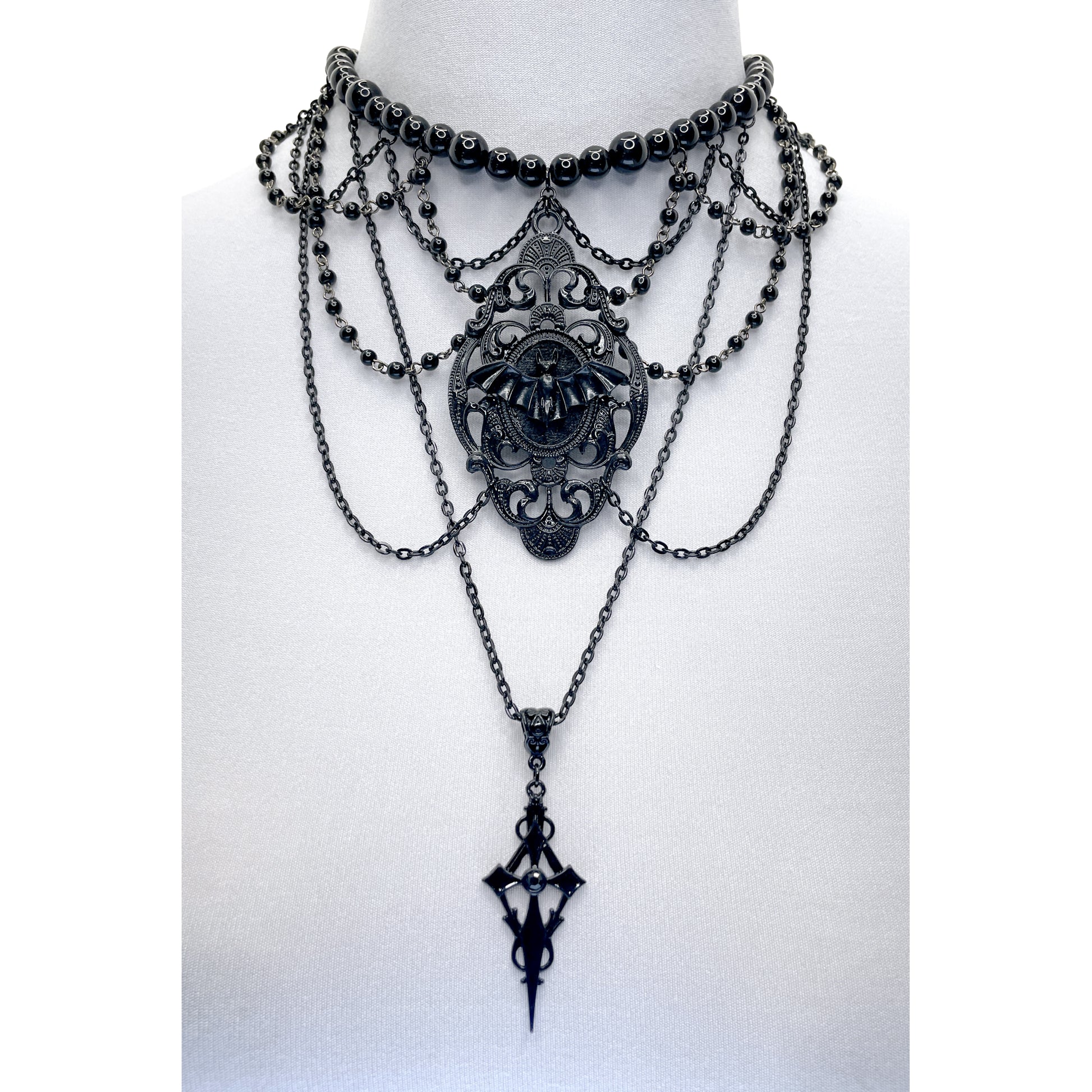 Black Multi-Strand Gothic Victorian Necklace with Bat and Long Hanging Cross