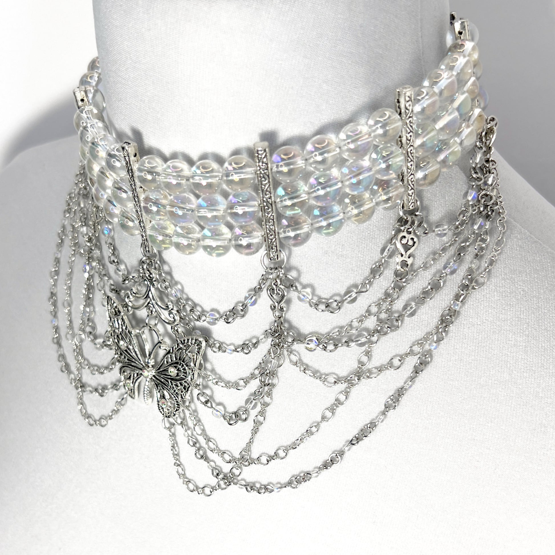Iridescent clear 3 row beaded choker necklace with 4 rows of handmade glass beaded chain and 3 rows of silver chain draped from it. There is a large silver butterfly in the front center with 5 iridescent rhinestones set in it to match the beads of the necklace. It is made of glass beads, not plastic, so it is very good quality.