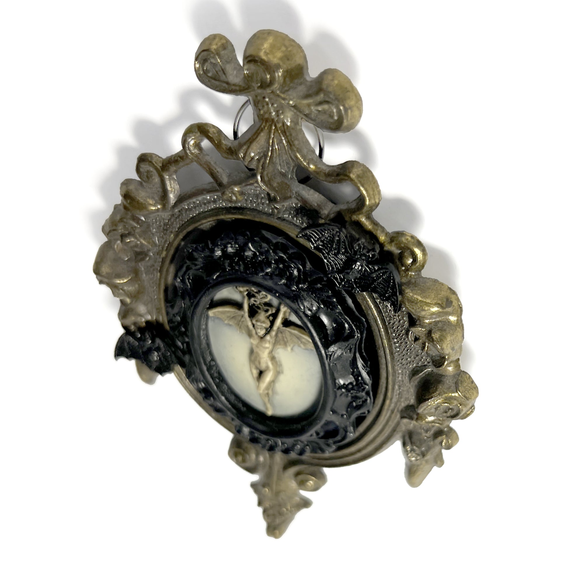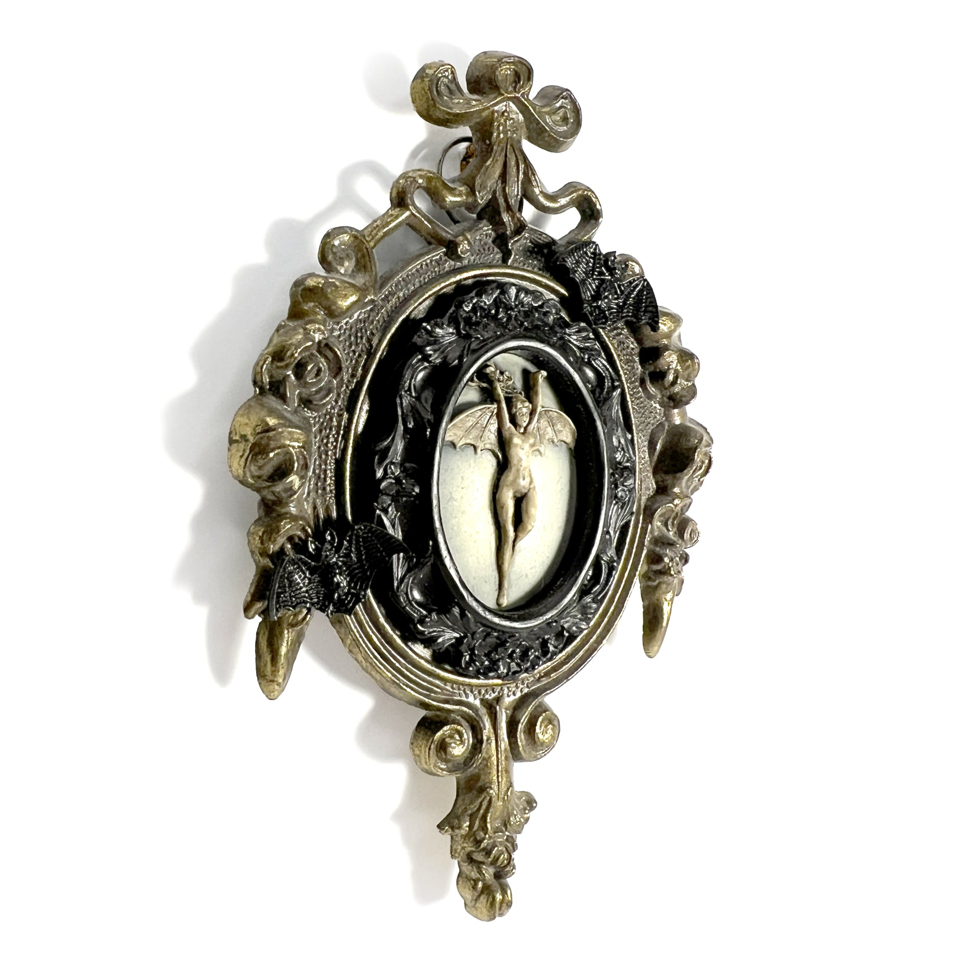 Brass ornate metal antique frame marked "Made in Italy" on the back. It has a cameo of the artwork Bat Woman in the center with a black resin frame around her. There are two black metal flying bats to the top right and bottom left of her on the frame. The frame is 8 ½ cm wide and 12 ½ cm tall.