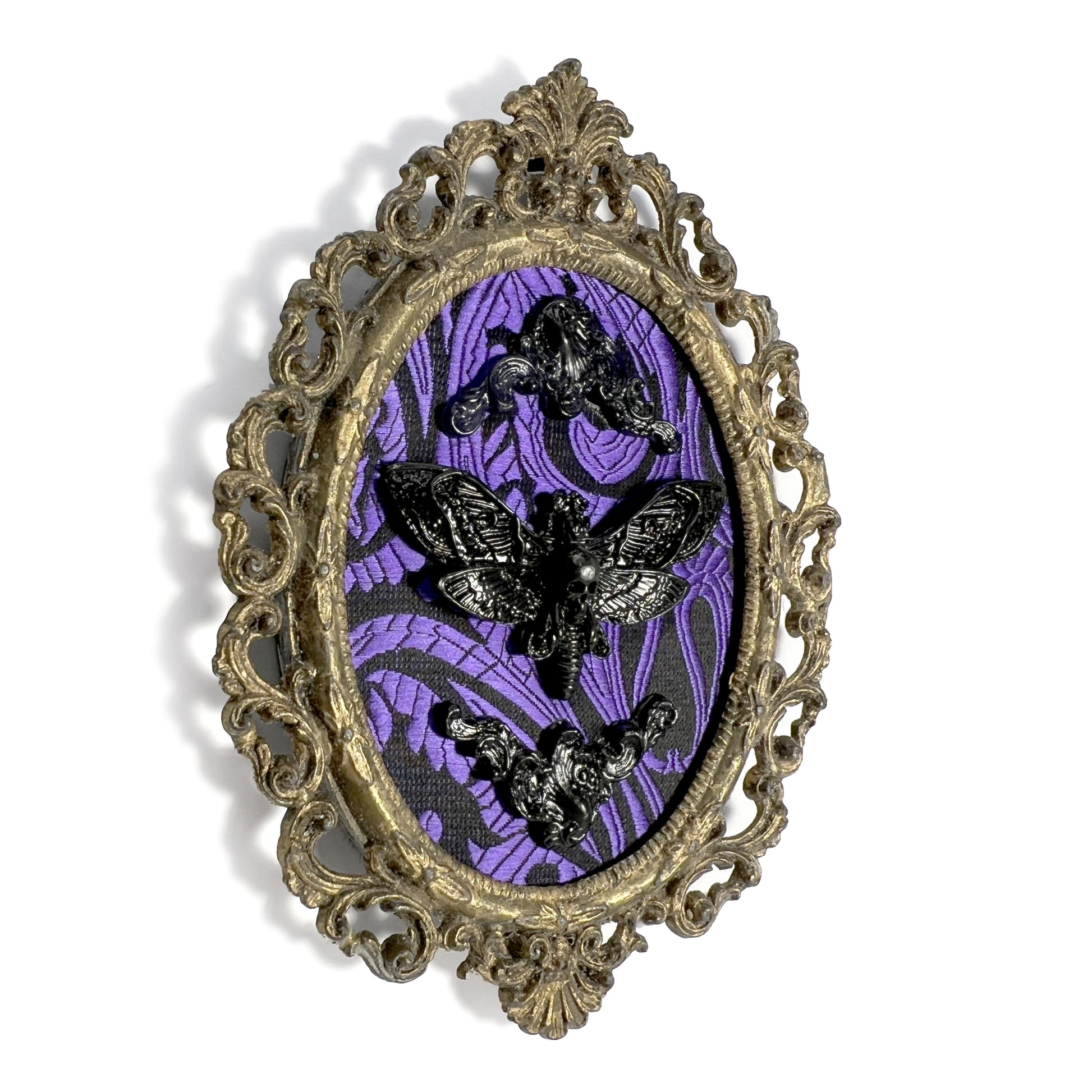 Brass oval metal antique frame marked "Italy" on the back. It has a black and dark purple fabric as a background. There is a large black flying death head moth in the center with a black resin V-shaped ornament above and below it on the fabric. The frame is 9 ½ cm wide and 13 cm tall.
