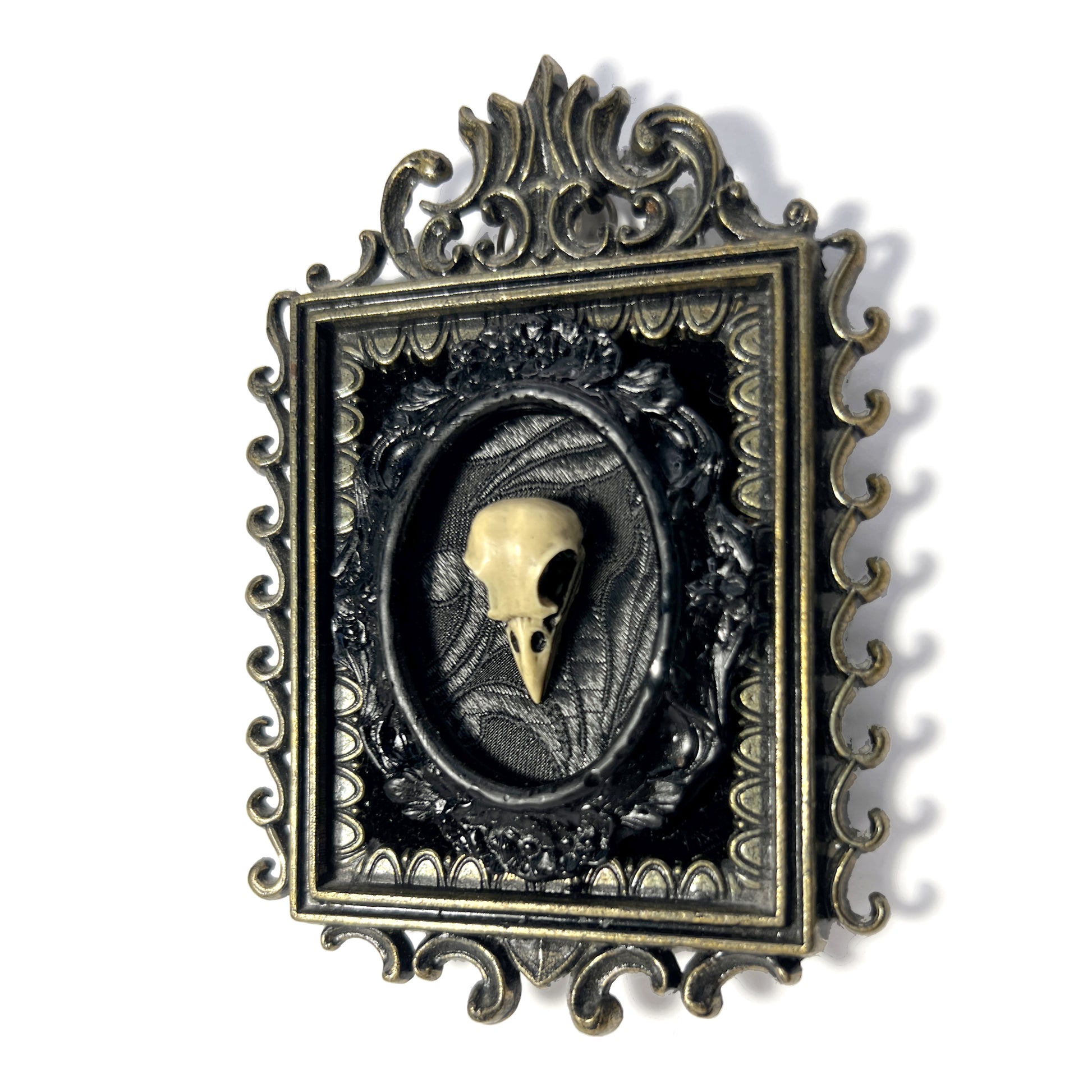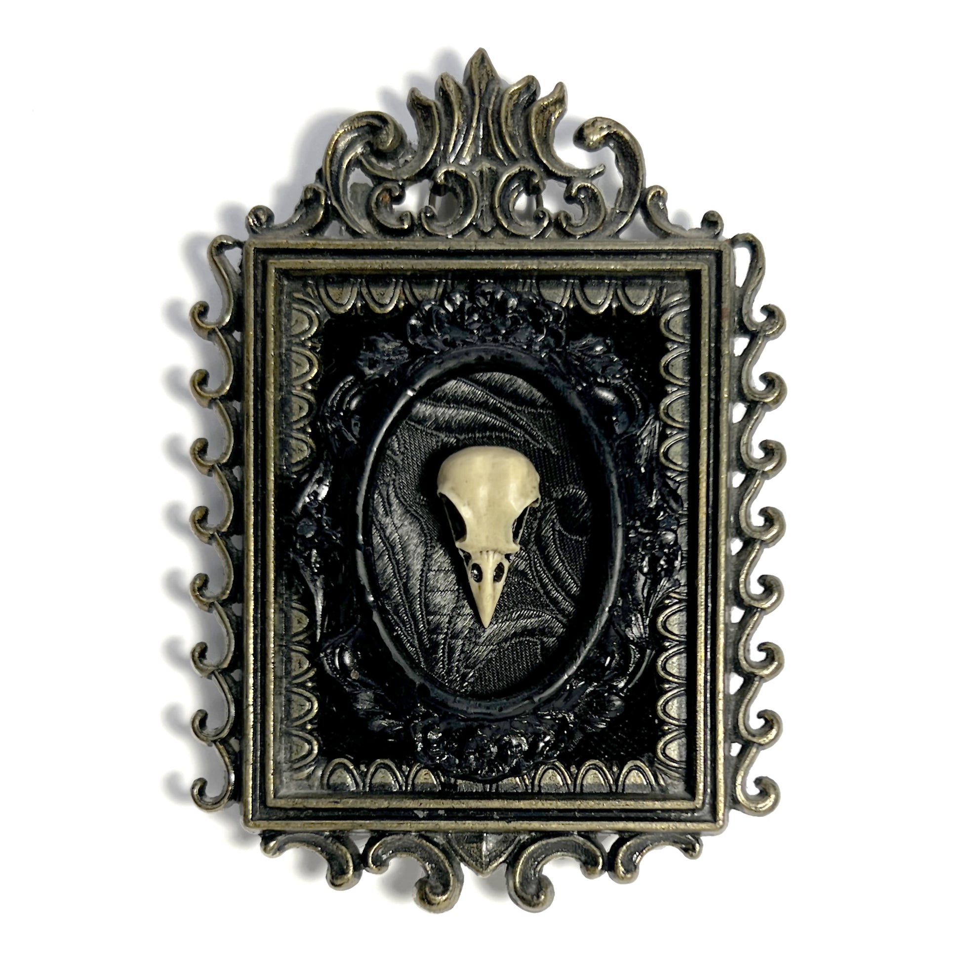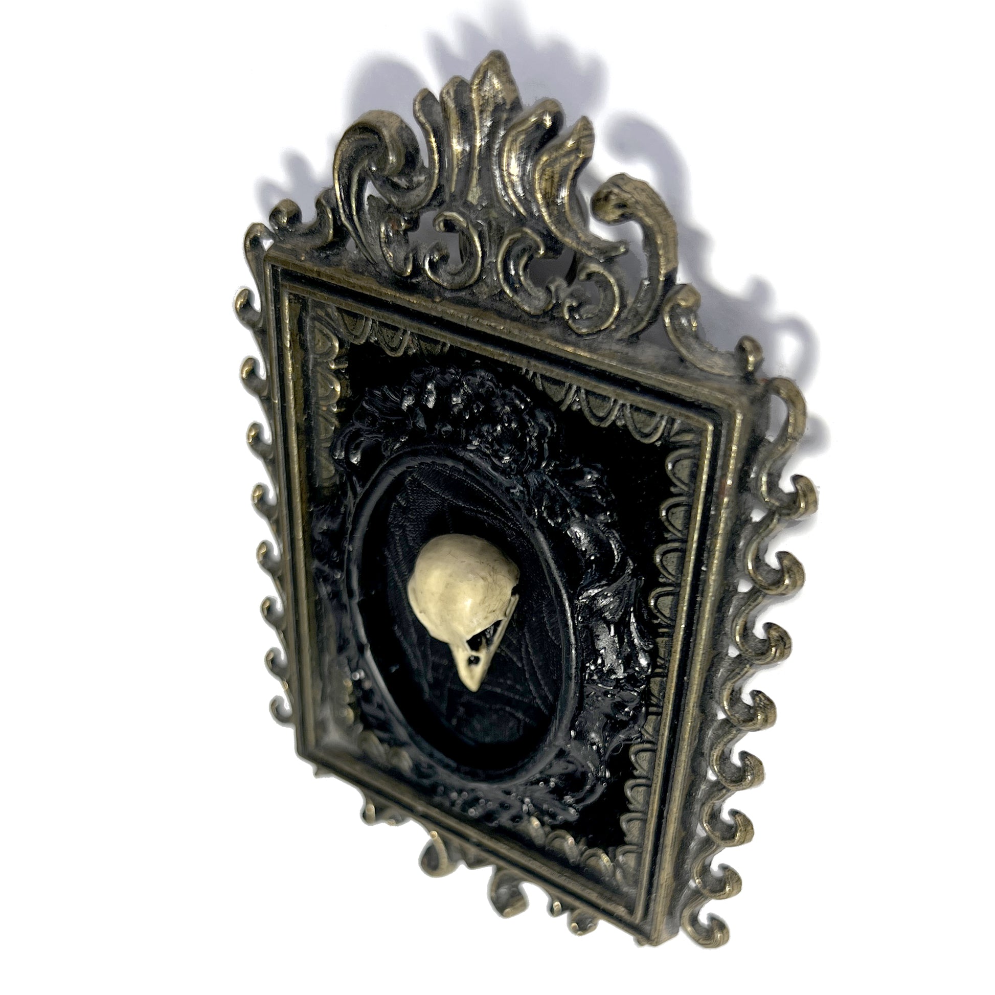 Small ornate square brass metal antique frame marked "Made in Italy" on the back. The background in the frame is black velvet. In the center is an antiqued small resin bird skull with an oval black resin frame around it. Inside the resin frame is a black on black fabric behind the skull. The frame is 7 cm wide and 10 cm tall.