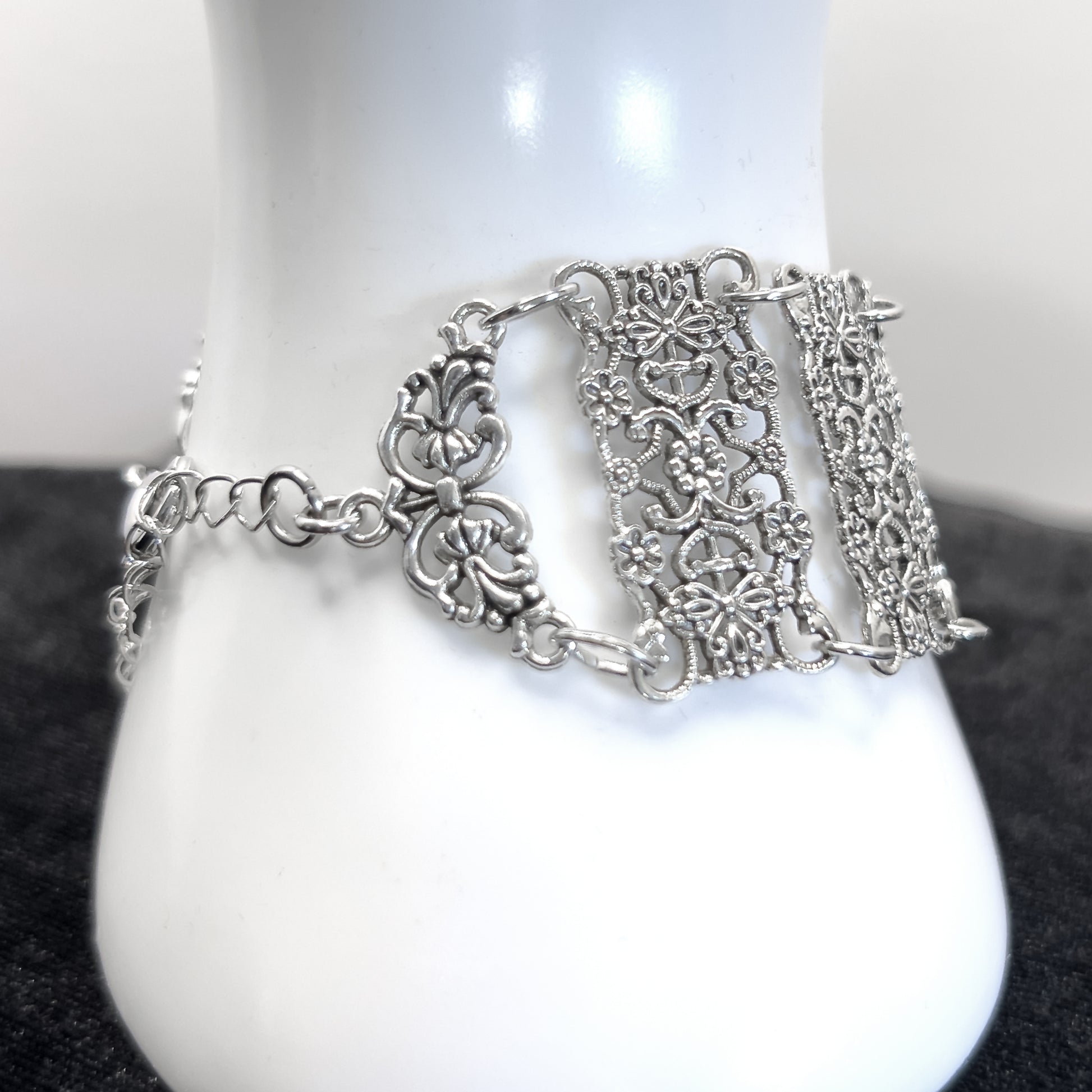 Stainless steel pretty gothic Victorian ornaments bracelet. The ornaments are attached to each other with oval rings so the bracelet lays flat. It has a large clasp to make it easier to put on and a chain with an ornament on the end to make it larger or smaller. The ornaments are 3 ¼ cm tall and 1 ½ cm wide. The bracelet is 18 ½ cm at it's smallest with a 6 cm chain.