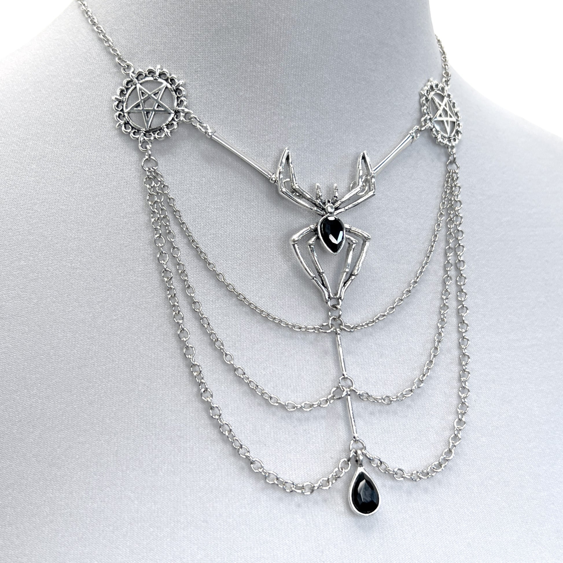 Large silver spider with a black faceted teardrop stone on the back. It is on a chain with two small pentacles on either side and three strands of silver chain draped below it. There is a faceted black drop bead hanging from the bottom. The necklace is 12 cm from pentacle to pentacle and hangs down 12 ½ cm. This necklace is adjustable.