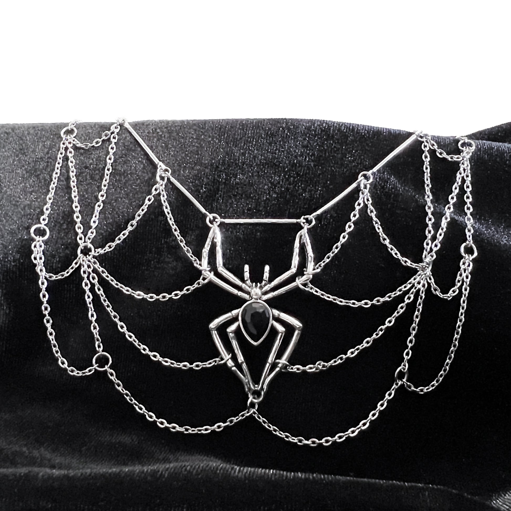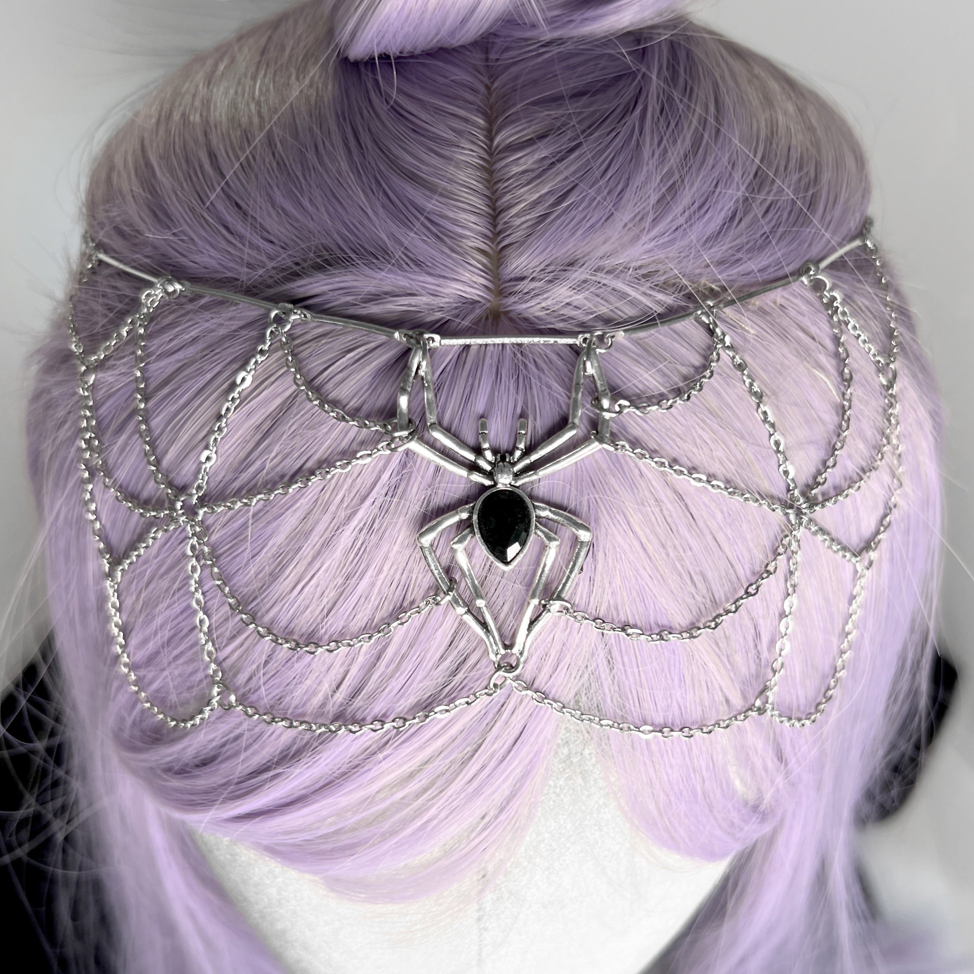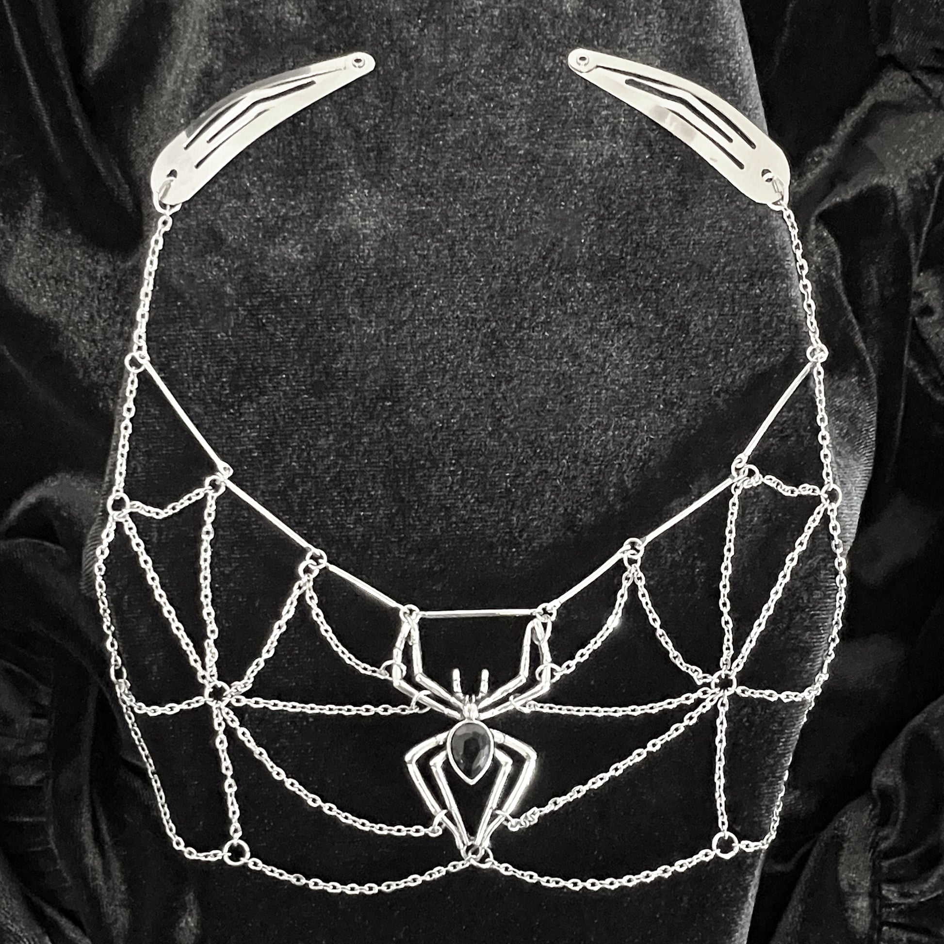 Stainless steel silver chain and large silver spider with a faceted black teardrop abdomen. The chain attaches with two clips into your hair.