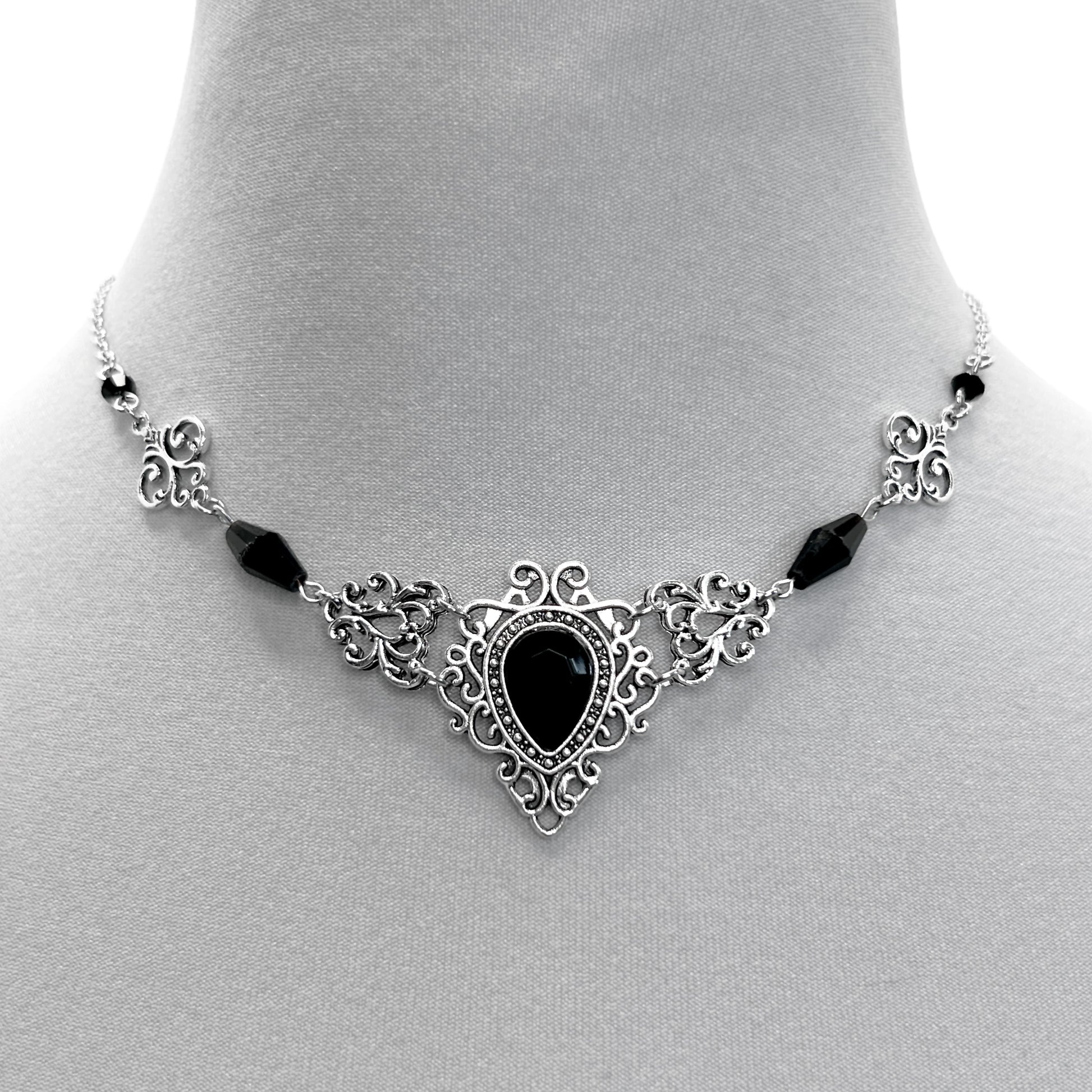 Linked silver stainless steel gothic ornaments with a faceted black teardrop pendant in the front and black glass beads. It is adjustable from 41 cm to 50 cm. I can add additional chain to make it longer if needed, just add a note to the order.