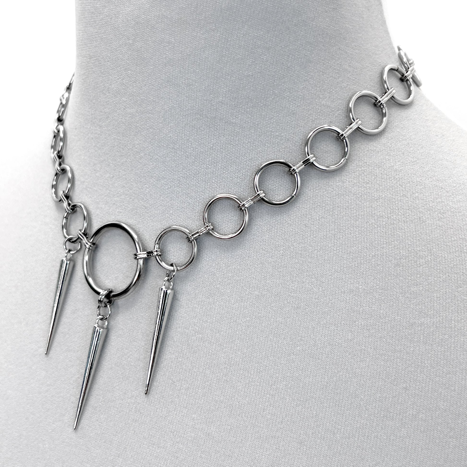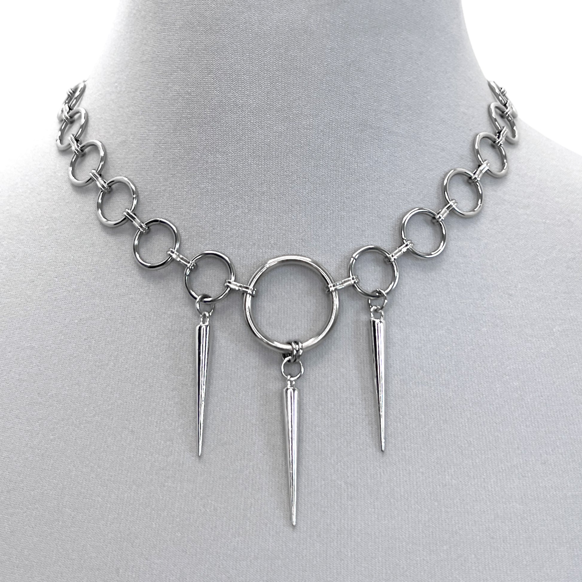 Linked silver stainless steel O-rings with a larger ring in the front and 3 spikes hanging from the front 3 rings. It is adjustable from 40 cm to 45cm. I can add additional chain to make it longer if needed, just add a note to the order.